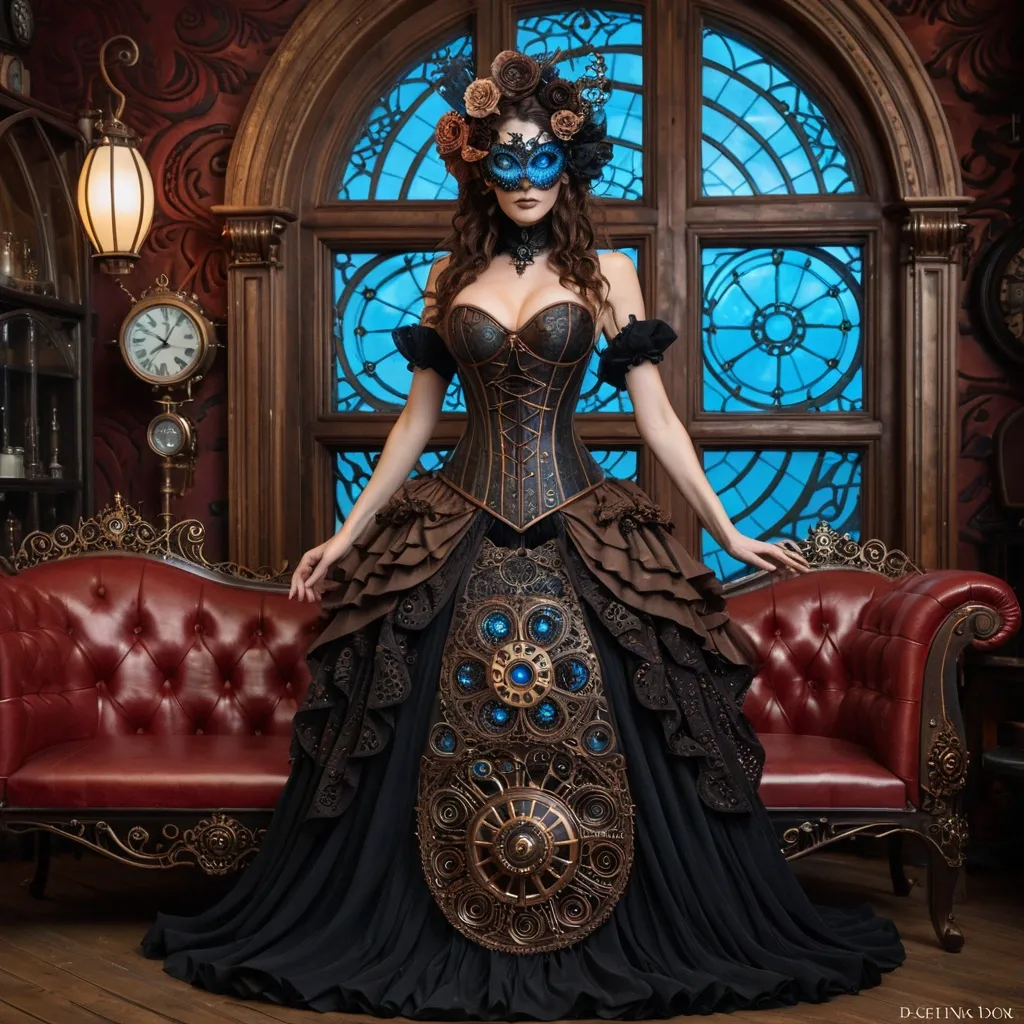 A combining a realistic figure with abstract organic forms resembling flowers and seashells , photo-realistic full length , freckled brown wavy shoulder hair kazaki woman in her mid twenties , A mysteriously veiled lady wears an intricately designed Vortex mask , wearing black and bronze corset opened lace steampunk dress , gracefully radiates charm , barefoot. Natural face , small nose , with natural makeup with expressive , bright blue eyes and a gentle smile. She have her right hand on her hair. she's laying on a red comfortable sofa , she is in a wooden steampunk boudoir. we can see a black moon through a window. ,