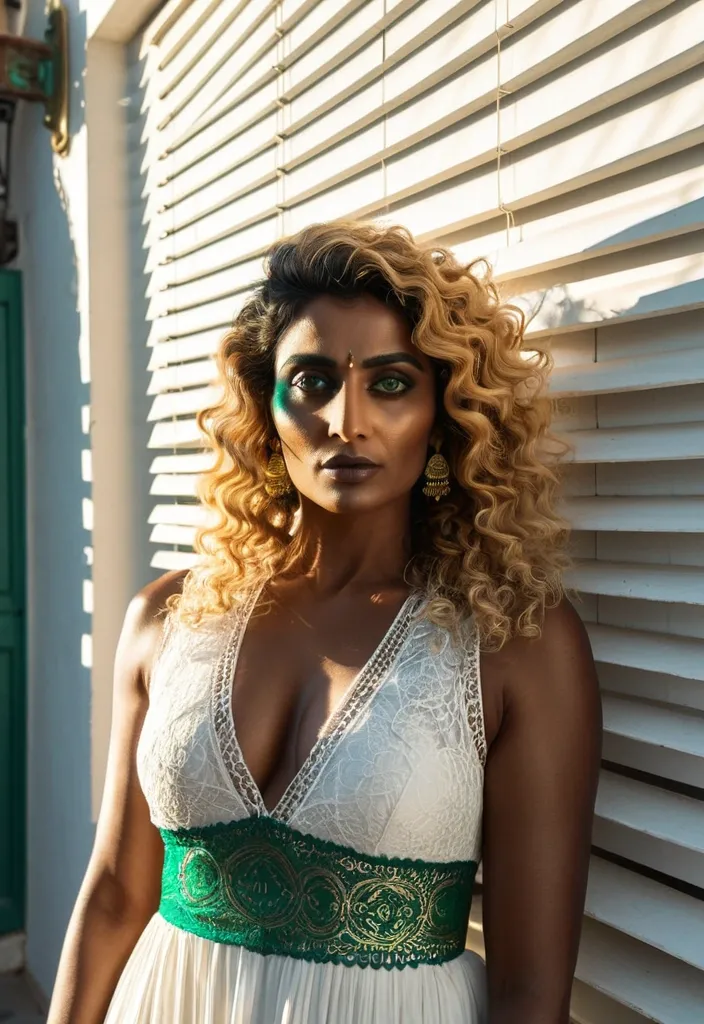 A full-height vertical portrait of a rajasthani young woman with dusky skin and vibrant , curly honey-blonde hair. She has captivating emerald green , blue , silver , and gold eyes , gazing directly at the camera. The setting is a sun-drenched gap between a wall , with diagonal shadows being cast from white wooden horizontal blinds across her face and hair. Wearing a sleeveless white lace dress. The composition is dramatic , cinematic , with strong hard light , complimentary colours , and direct harsh shadows , showcasing her poise and elegance. ,