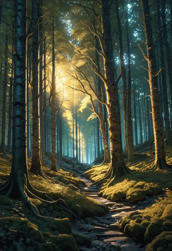 A realistic forest with birches , oaks , ash trees , intense trees , Hinds , Highly detailed , Little sunshine , digital painting , sharp focus , illustration , night light , art by artgerm and greg rutkowski and alphonse mucha , 4k. Seed : 5668 | Scale : 7.5 | Steps : 25 | Img Width : 512 | I mg Height : 512 | model_version : 1.4tf , image 9:16 ,