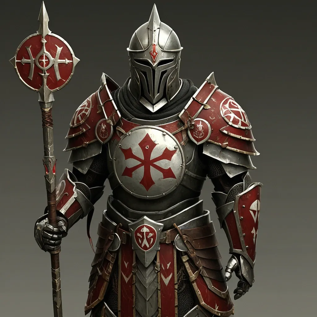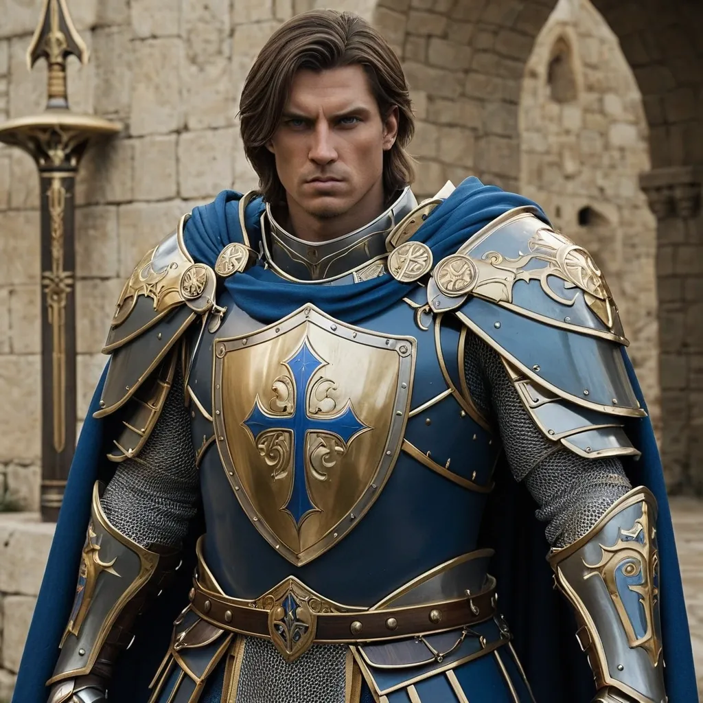 Human General: Athletic , balanced build. Facial features are determined yet noble. Paladin: Armor: Full plate armor with heraldic ornamentation. A blue cloak with a gold lining drapes over the shoulder. Weapon: Sword – a straight , broad blade channeled with holy energy. Shield – a large , teardrop-shaped shield. ,