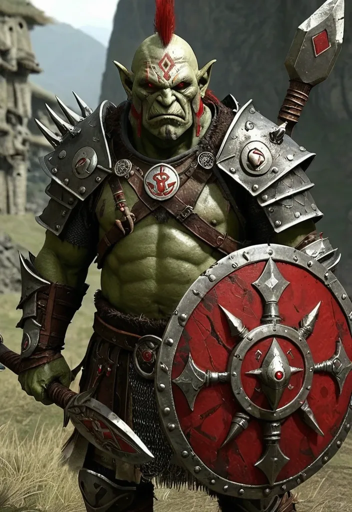 Орк (Orc) Общее: Массивные , с зеленой/серой кожей , клыками , шрамами. Доспехи составлены из трофеев и грубых материалов. Воин-Дамагер (Warrior-Damager): Доспех: Кожаные и костяные латы , часто с шипами. На плечах — черепа или рога. Оружие: «Топор Раздора» (Двуручный топор) — огромный топор с двойным лезвием , насаженный на древко , обтянутое кожей. Клинки зазубрены. ,