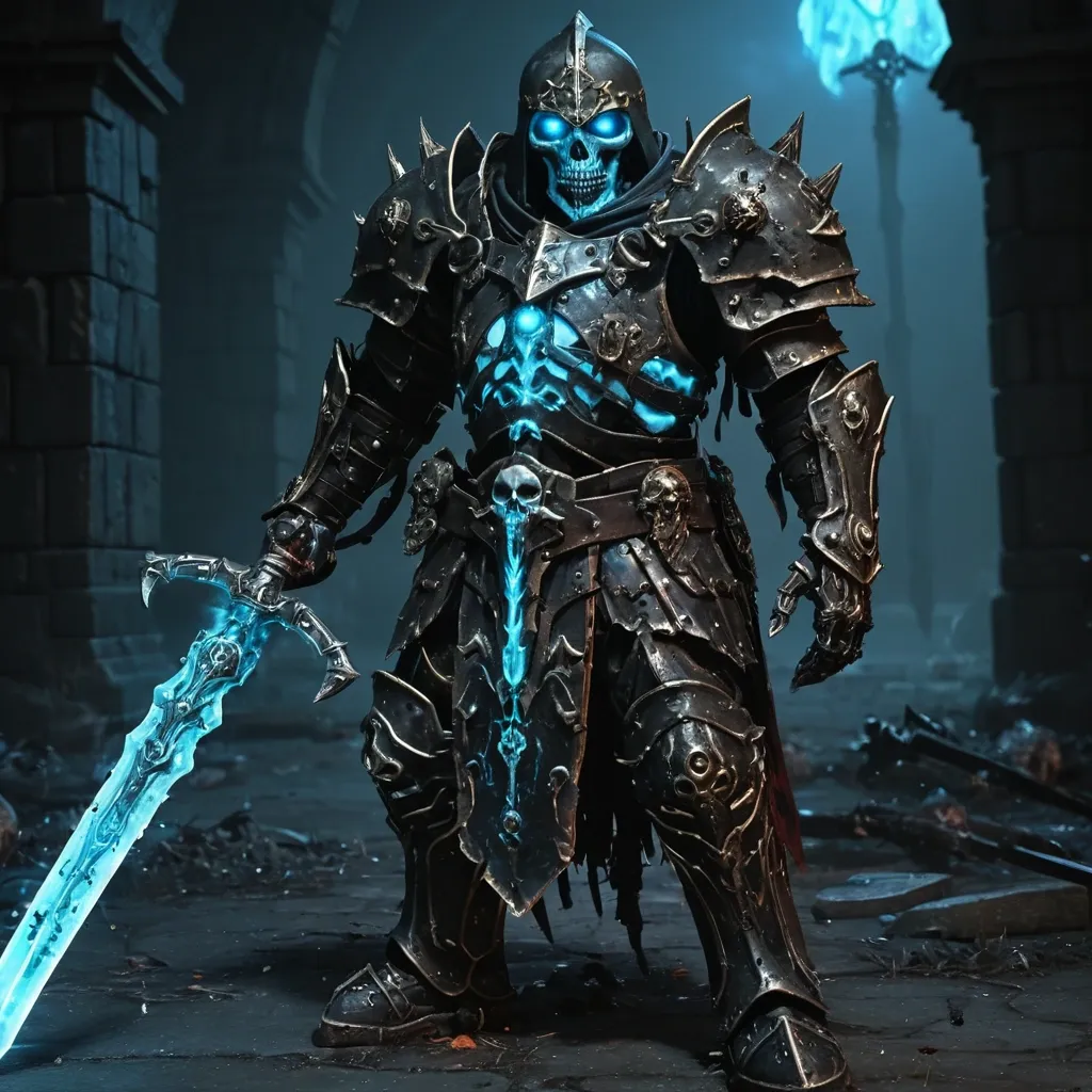 Нежить (Undead) Общее: Частично разложившиеся тела , светящиеся глаза в пустых глазницах , кости , видимые сквозь плоть. Доспехи выглядят древними и проклятыми. Воин Смерти (Death Knight): Доспех: Ржавые , почерневшие латы , сросшиеся с телом. Из-под шлема — голубоватое свечение. Оружие: «Рунический Клинок Расплаты» (Двуручный меч) — ржавый меч , по лезвию которого текут темные руны. При ударе они вспыхивают. Скелет-призыватель — костяной воин с обломками оружия. ,