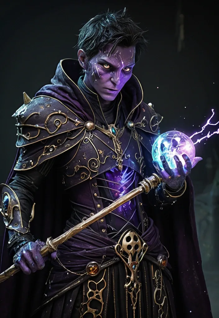 Role: Chaotic support. His magic is as unpredictable as his own nature. Appearance: Leaner and androgynous. His eyes have a mad glint or a chaotic shimmer of various colors. "Magic scars"—glowing veins of unstable energy—are visible on his skin (often on his face and hands). Armor/Robe: Luxurious but tattered clothing. A velvet cloak with faded patterns , beneath which is a leather corset/vest with bone inlays. Numerous amulets , rings , and bracelets , each seeming to contain its own essence , shimmer and glow chaotically. One arm may be wrapped in occult bandages that emit a dim light. Colors: deep purple , dark gold , poisonous green , black. Weapon: "Staff of Chaotic Principles" This is not a staff , but a wand or short scepter that can be held in one hand while the other sorcerer makes chaotic gestures. Handle: Bone or ebony , wrapped in wire of various metals. ,
