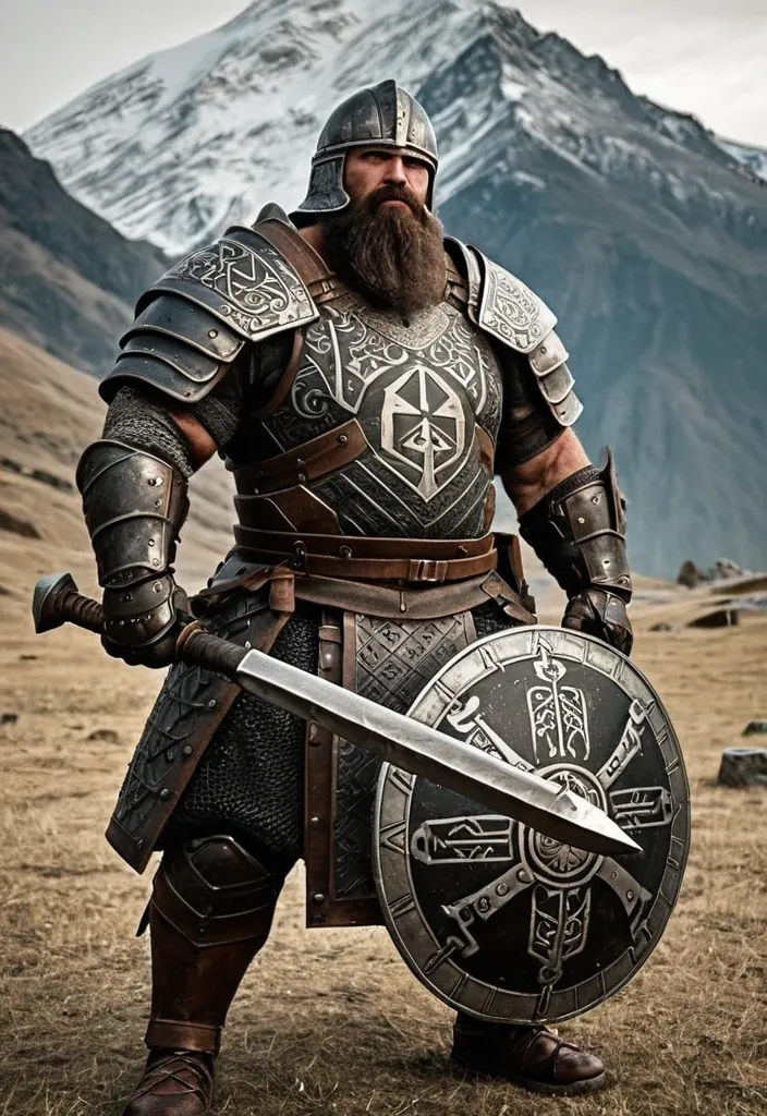 Общее: Приземистые , мускулистые , с густыми бородами. Доспехи массивные , покрытые рунами и геометрической чеканкой. Латник (Man-at-Arms): Доспех: Тяжелейшая пластинчатая броня , покрывающая все тело. Шлем с T-образной прорезью. На щите — горный пик. Оружие: Молот — кузнечный молот боевых размеров. Щит — огромный квадратный щит , который можно воткнуть в землю. ,