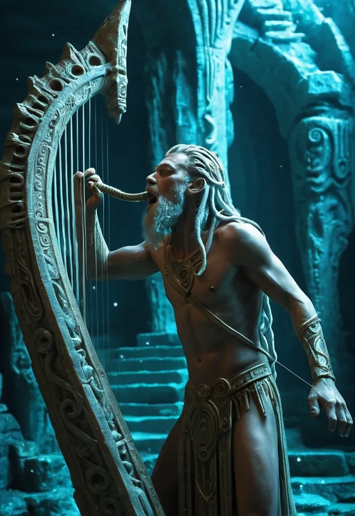atlantean male playing stalactites as if they were a harp as he sings ancient melodies and light exits his mouth like mystic wind ,