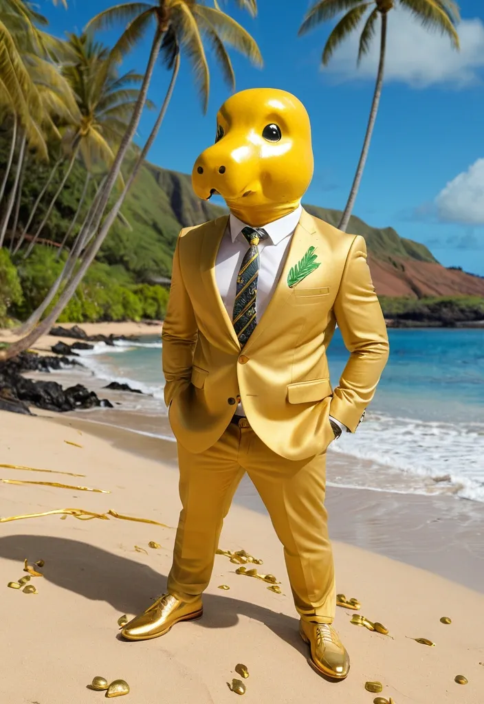 Нарисуй золотого Лабубу в деловом костюме , жующего жвачку на берегу Гавай среди пальм ,