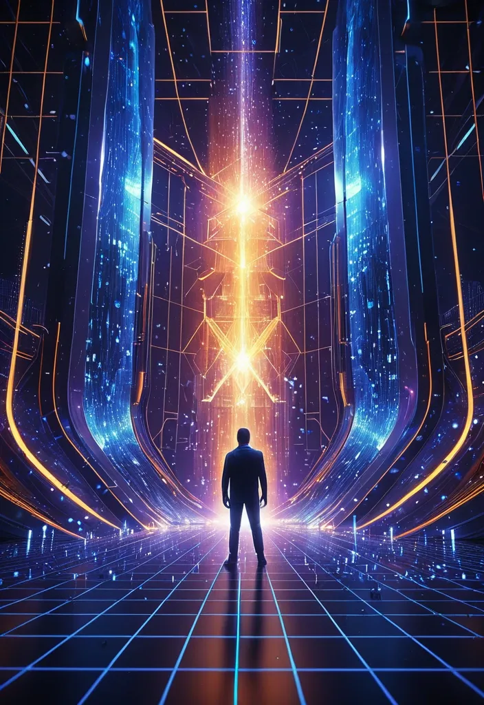 Professional technology workspace , cinematic lighting , a scientist with a music keyboard standing infront of a large glimmering portal , cascading streams of luminescent code and data particles , multiple sound waveforms in sophisticated geometric forms - crystalline spheres , tessellated cubes , and flowing pyramidal structures , each containing visible DNA double helix patterns glowing with bioluminescent blue and amber light representing encoded company methodologies and strategic DNA , interconnected by dynamic particle streams of contextual information flowing like neural networks , background featuring live sound music speaker arrays , color palette of deep blues , warm oranges , and rich purples , volumetric lighting with god rays , hyperrealistic rendering with sci-fi elements , professional corporate aesthetic merged with futuristic technology visualization , 8K detail , representing the interaction of man and machine in a sonic universe ,