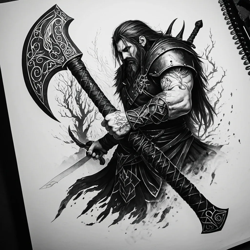 Diseñame un acha a dos manos con una temática de fantasía oscura siendo entintado en blanco y negro ,