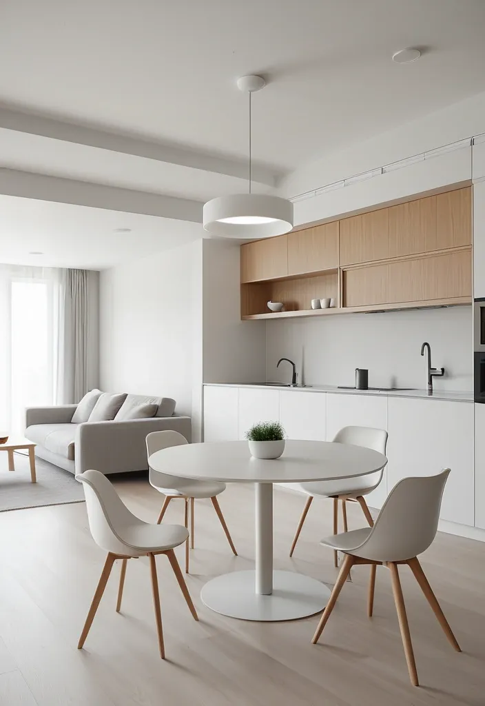"Интерьер гостиной-кухни размером 7100×4000 мм в современном минималистичном стиле. Пространство светлое , воздушное , с простыми геометрическими формами. Обычное прямоугольное окно без декора , много естественного света. Цветовая палитра: белый , светло-серый , тёплое дерево. На кухне — линейный гарнитур вдоль длинной стены , встроенная техника , гладкие матовые фасады без ручек. Обеденная зона с круглым столом и минималистичными стульями. В гостиной — компактный диван , низкий журнальный столик и медиа-зона. Потолок ровный , встроенное освещение , скрытые источники света. Чистые поверхности , минимум декора , акцент на объёме и фактурах. Фотореалистичный рендер , мягкие тени , высокая детализация." ,