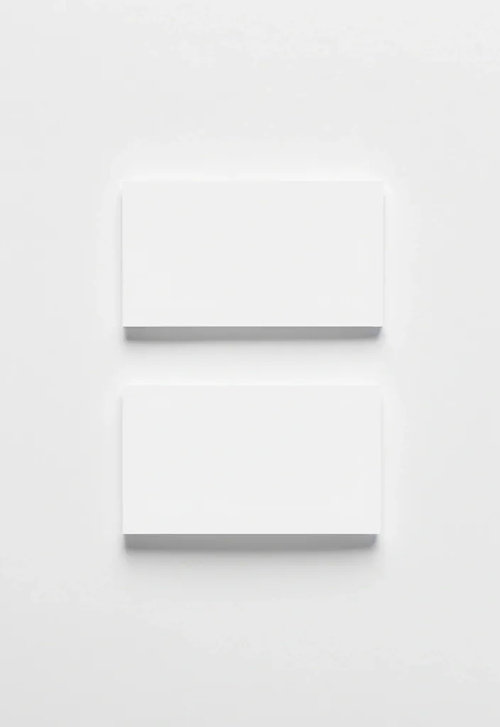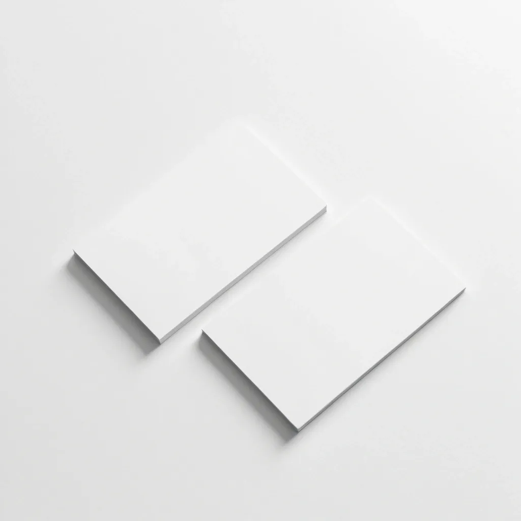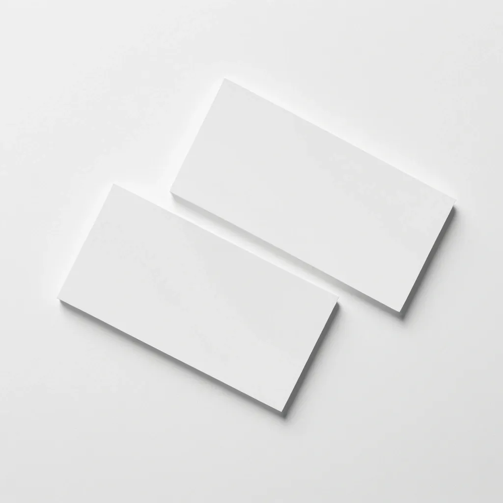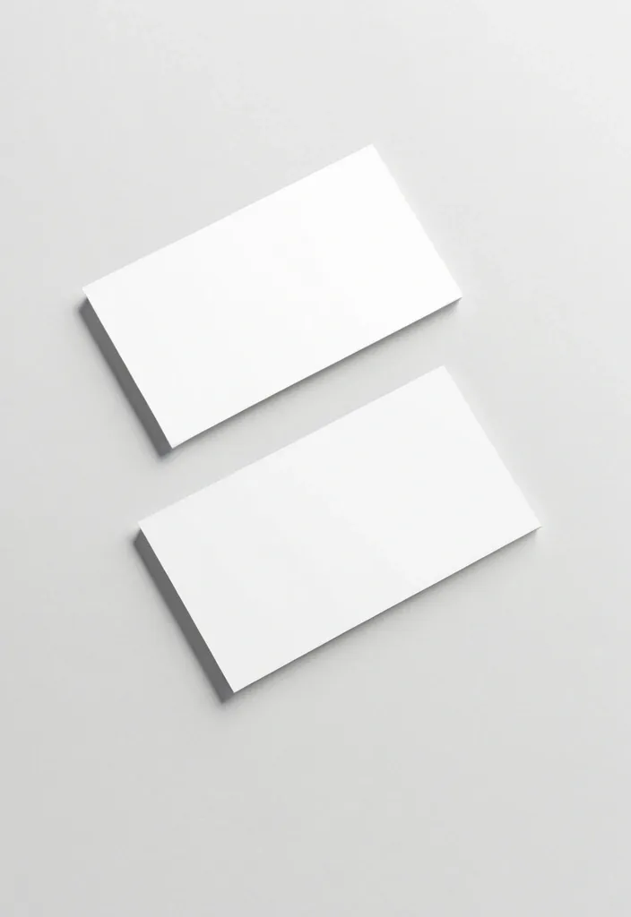 Top-view minimalistic mockup of two blank white business cards , clean and modern layout similar to a professional business card design. Both cards are fully white with no text , no logos , no icons , no QR codes. Flat 2D look without perspective distortion. No background elements , no table texture , no plants — pure white backdrop. Soft , even lighting , high-resolution , crisp edges. ,