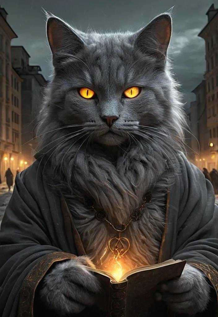 I want you to create a cat with the following characteristics at this moment: He had amber eyes , gray fur , and an ancient silence in his gaze , but no name to hold him. One night , while the city slept and humans dreamed of things they would never do , he decided to leave. He felt he had been thrown into the world without instructions , as if his existence were a book without a title. Thus his journey began. ,