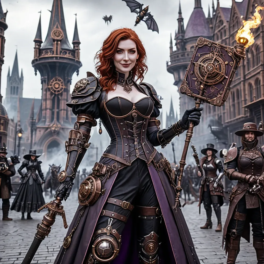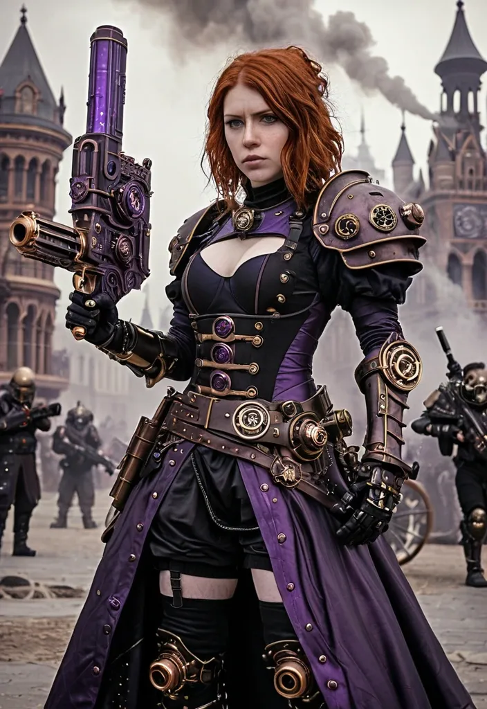 realistic face , a wavy shoulder auburn hair 25yo pale woman , wearing black and purple steampunk dress armour have a steampunk lmagic staff in her right hand and an opened magic book on her left hand , she's standing fierly with a shy smile on a steampunk city battlefield. some aliens monsters on the background and fires ,