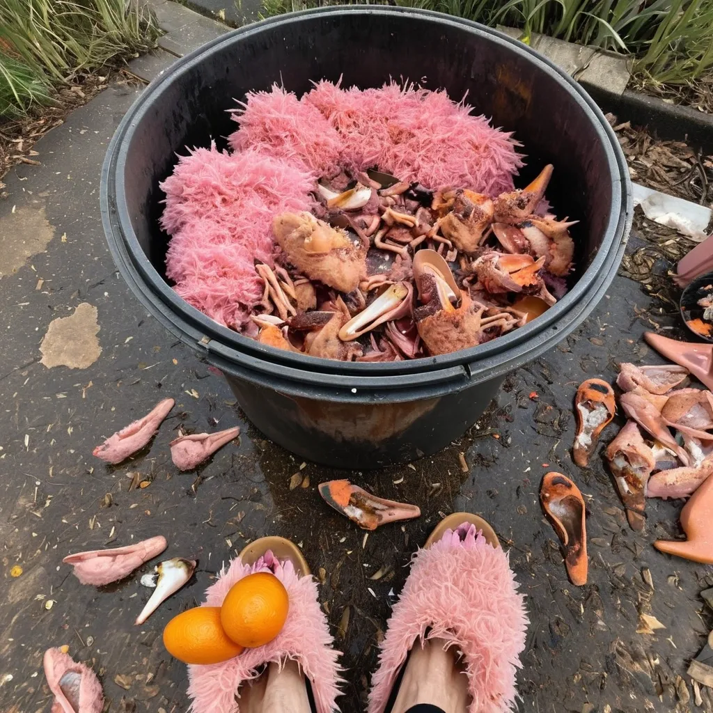 A view into a dirty outdoor Australian waste disposal bin containing a pair of stained and broken , well worn stiletto heeled pink fluffy slippers surrounded by food waste that includes cooked chicken and fish bones still with meat on them , small tufts of pink fluff from the slippers , and mouldy orange peel. ,