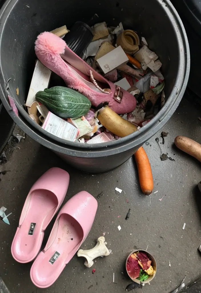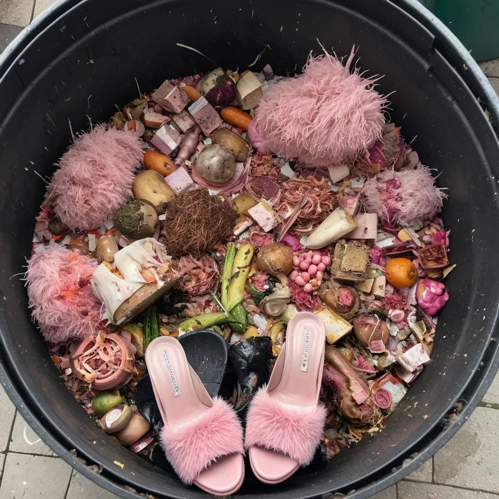 A view into a dirty rubbish bin that has not been cleaned for years which contains a pair of stained and broken , stiletto heeled pink fluffy slippers surrounded by food waste that includes bones and rotting vegetables. The slippers are partly buried in the food waste , one slipper is on its side. ,