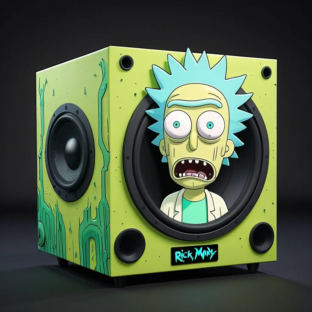 A designer image for a Rick and Morty-themed stealth subwoofer. A grill will be installed on the speaker itself. ,