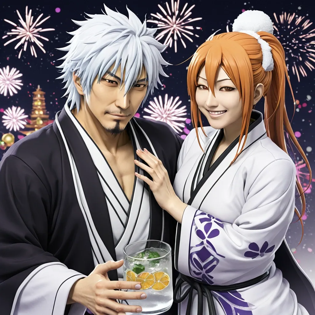 Gin Ichimaru from bleach and Rangiku Matsumoto from bleach in bleach artstyle celebrating new years with new years text at the bottom of the image ,