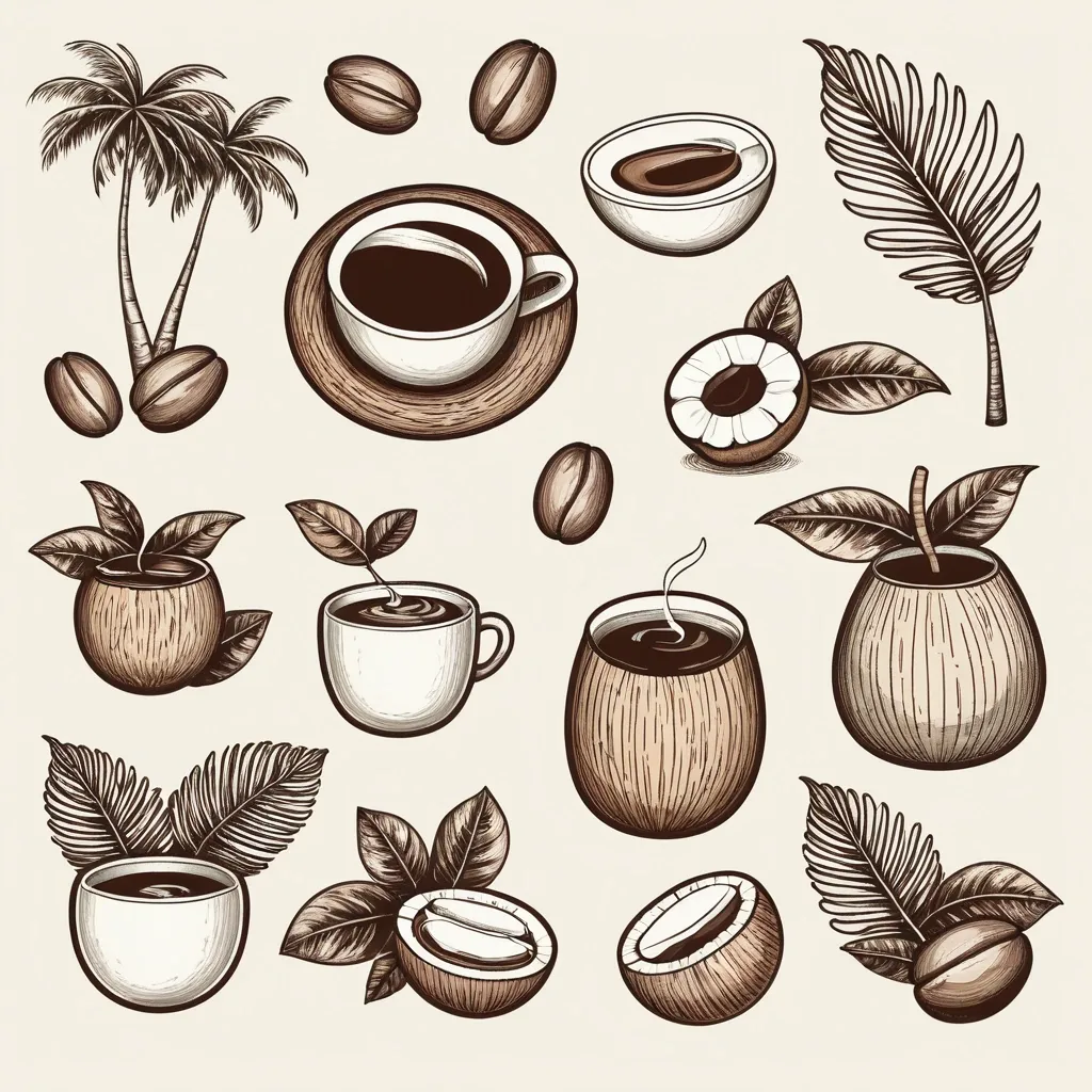 Generate a vector image for me with clean lines , but a hand-drawn look , with only a few strokes. Let it consist of just an outline , without any color inside. Create an image of coffee with coconut. Perhaps it will be an image of a coconut , coffee beans , and decorative leaves. Generate 10 variations. Make the image delicate yet stylish. ,