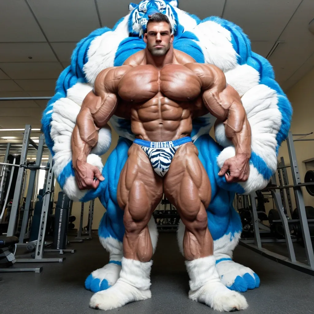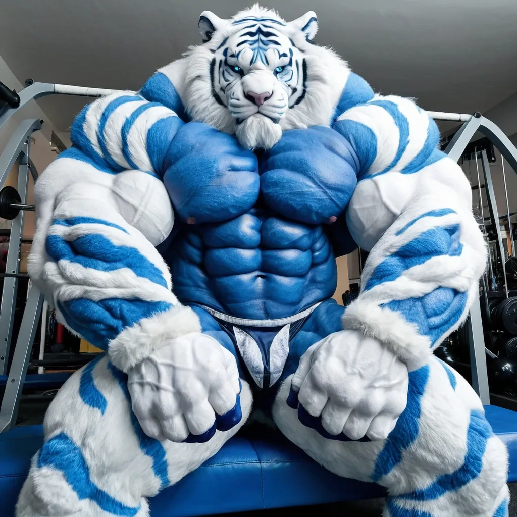 Incredibly big mass muscular muscles and huge biceps muscular body tallest body muscular legs Large arm and abdominal muscles blue white furry Tiger ,