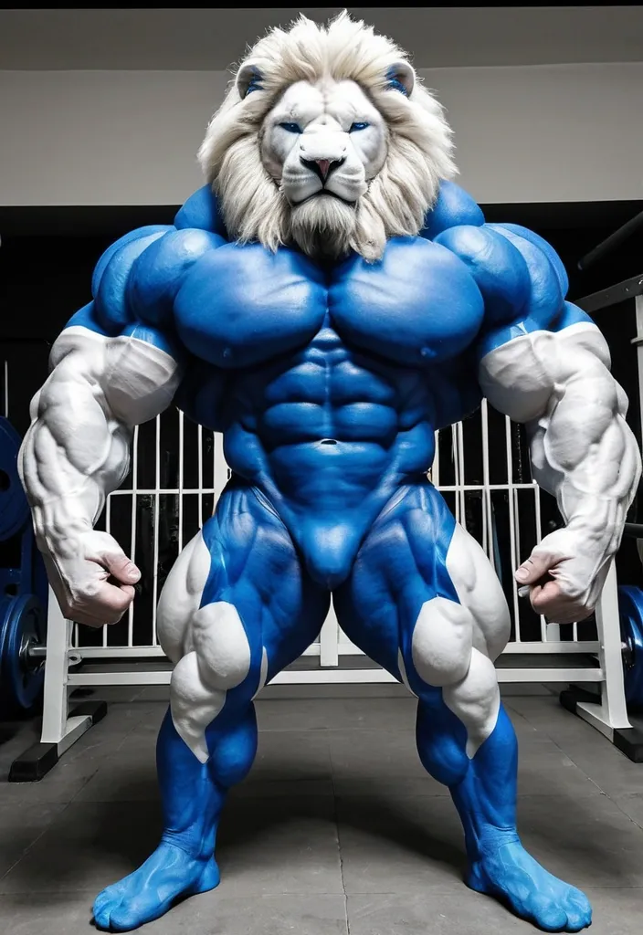 Incredibly big mass muscular muscles and huge biceps blue white lion ,