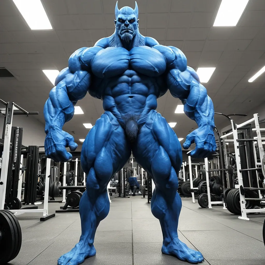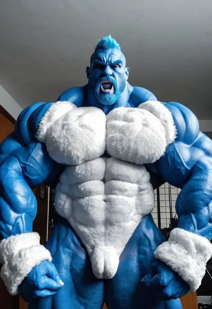 Incredibly big mass muscular muscles and huge biceps muscular body tallest body muscular legs Large arm and abdominal muscles blue white werewolf ,