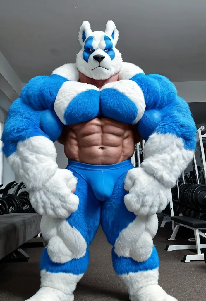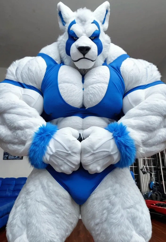 Incredibly big muscular muscles and huge biceps blue white furrsuit ,