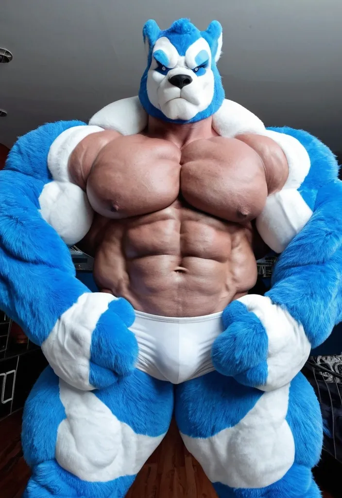 Very biggest growht muscule blue white furry furrsuit ,
