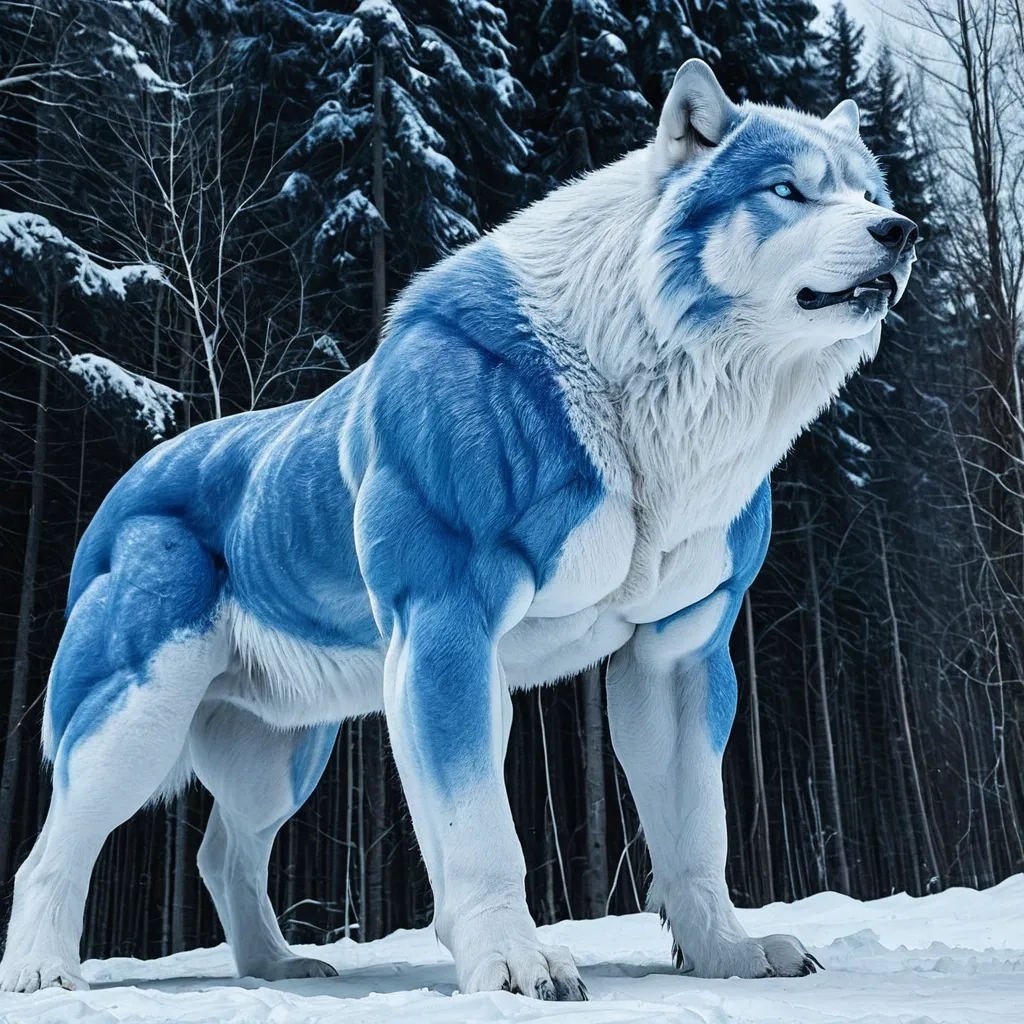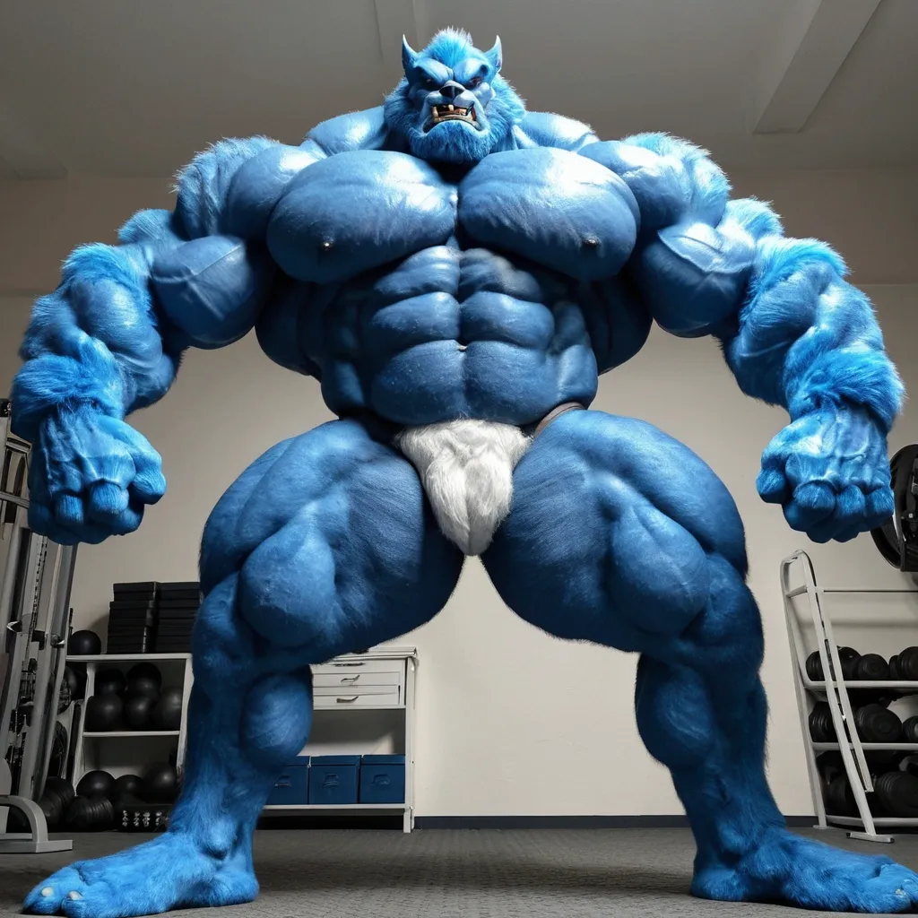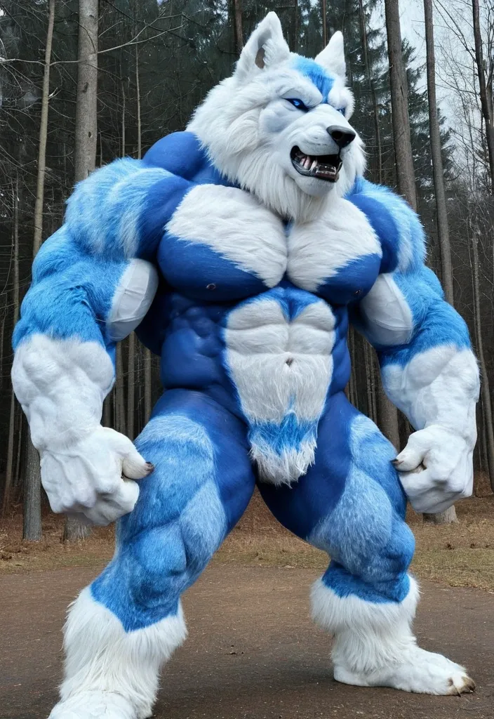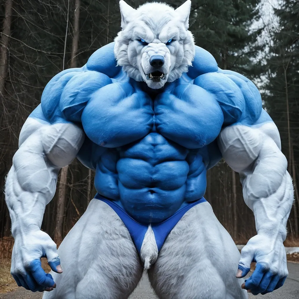 Incredibly big mass muscular muscles and huge biceps muscular body tallest body muscular legs Large arm and abdominal muscles blue white furry werewolf ,