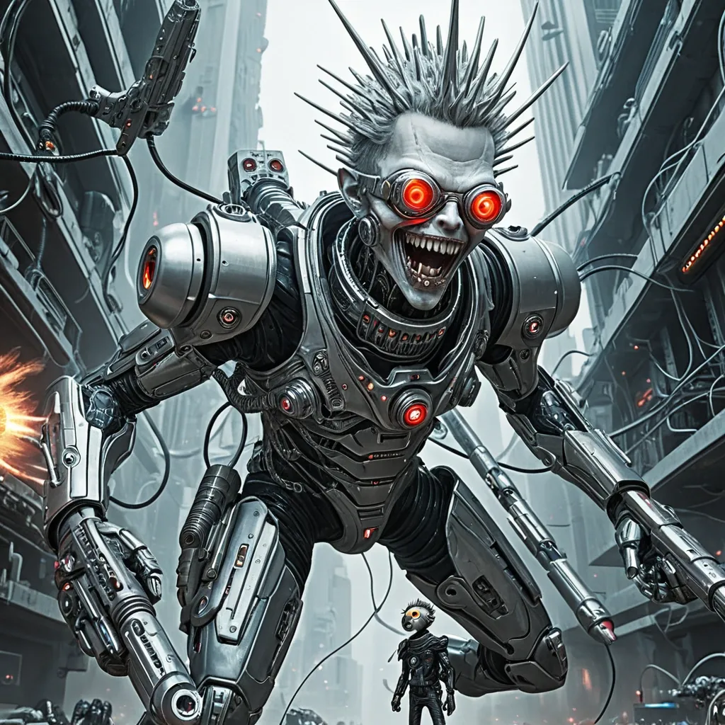An alien cyborg , silver armor , tubes around his neck , eyes on his shoulders , a one-eyed cyclops , wearing a cybernetic eye mask , his mouth hanging out laughing with vampire-like teeth , spiky hair made of metallic cylinders , two futuristic .40 caliber pistols , gliding like a surfer performing an aerial maneuver , along an alien electrical wiring of gigantic cables that connect various cyberpunk buildings of an alien city , at breakneck speed , while exchanging gunfire upside down , against futuristic alien police ships that pursue him and fire missiles that he deflects during the maneuvers. ,