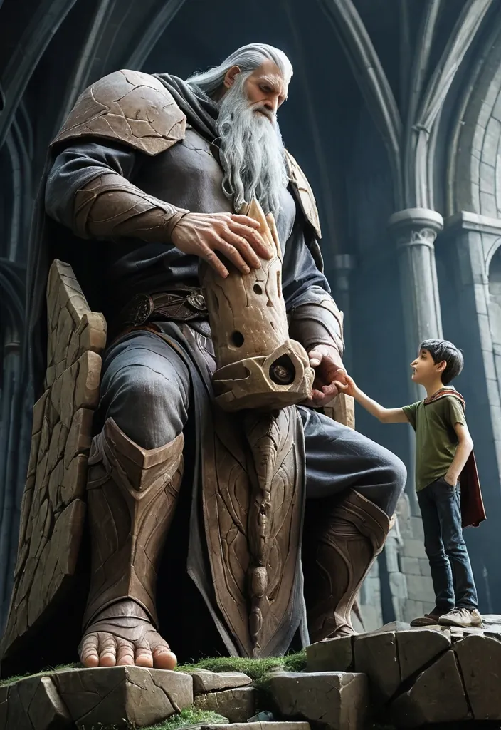 The giant is building a stonehand , and the magician Merlin is sitting on his shoulder. ,