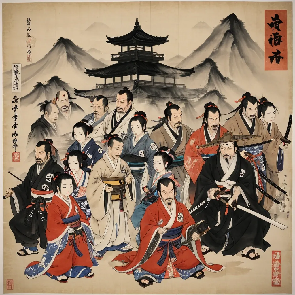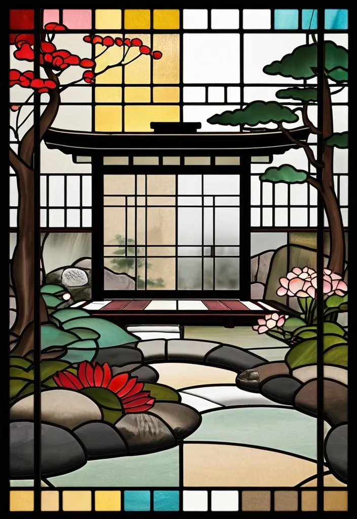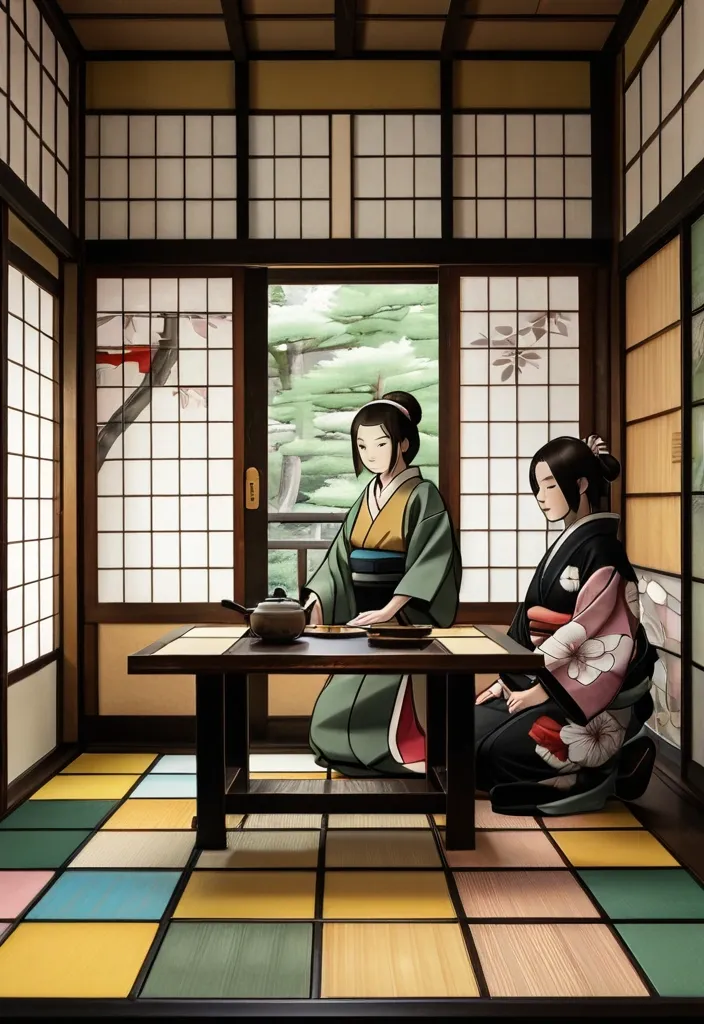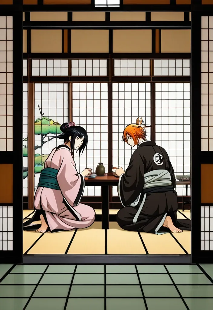 Make a stained glass style image of the interior of a Japanese teahouse. Include a shoji screen , a table , two persons in kimonos , a tatami , and a katana stand. The persons are Ichigo Kurosaki and Yoruichi from the anime series Bleach. The colors are black , white , red , yellow , beige , dark green , pink , grey , brown , and light blue. ,