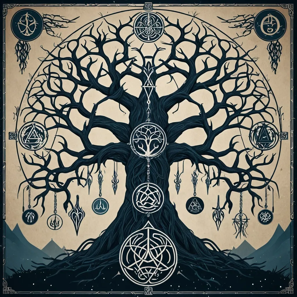 Viking Norse Saga style picture of Ygdrassil. The 9 branches represent the 9 realms (for example , Asgard , Midgard , Jotunheim , and so on). Use a representative image of the realms for each endpoint of the 9 branches. Include the figure hanging upside down from the Ygdrassil tree. Also include elder futhark runes around the image. Use brown , petrol blue , black , red , and white colors. ,