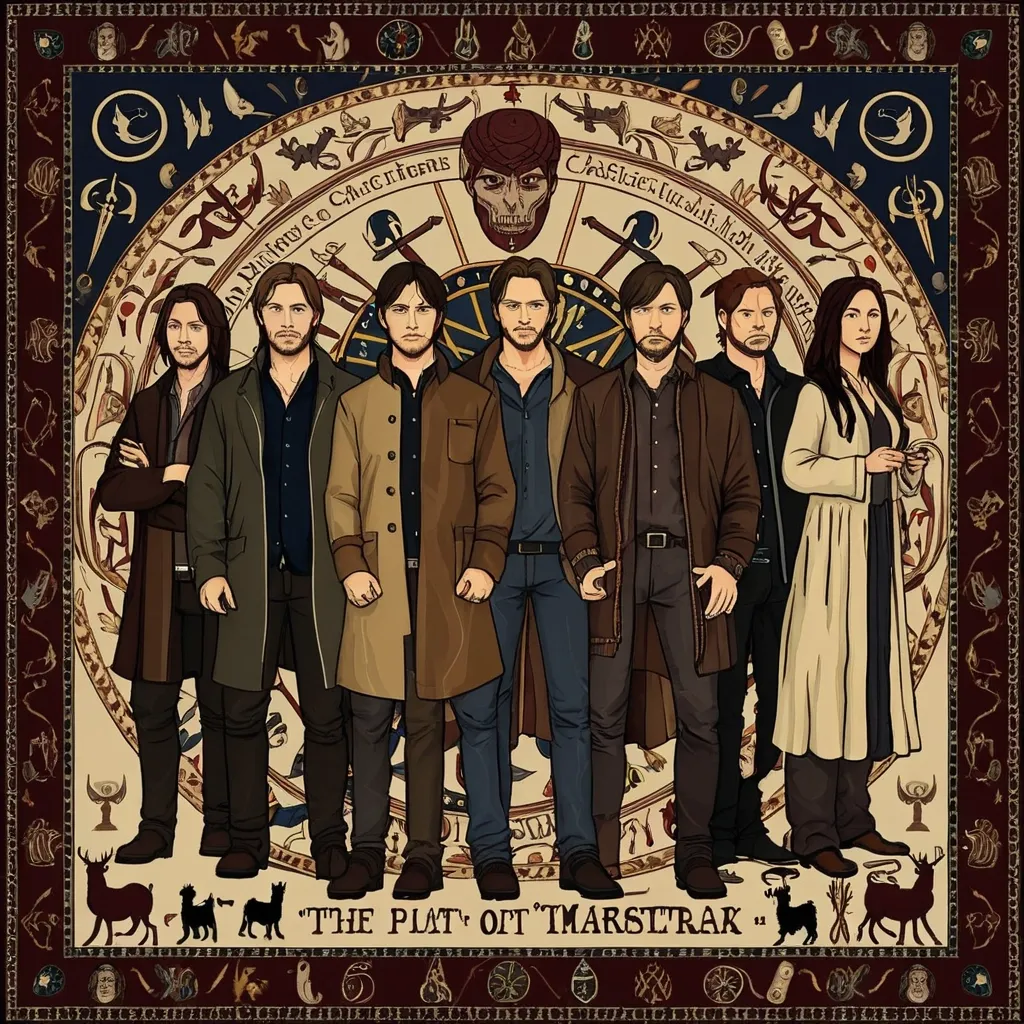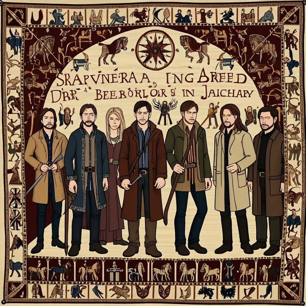 Make a tapestry image similar to the Bayeaux Tapestry. Look up the image at https://en.wikipedia.org/wiki/Bayeux_Tapestry. The tapestry should illustrate characters from the TV show titled Supernatural. Include Sam and Dean Winchester , Castiel , Bobby Singer , Jody Mills , Abaddon , Crowley and Rowena. ,