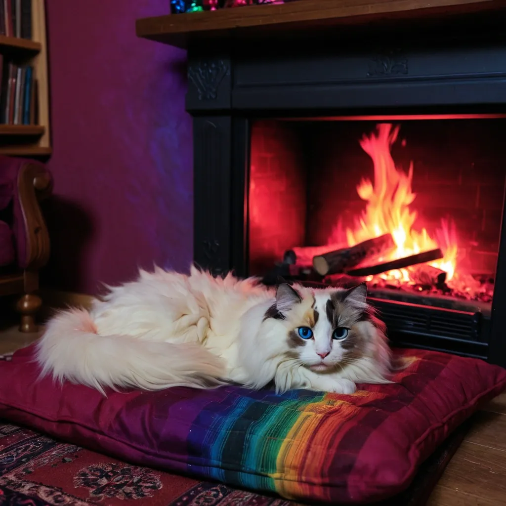 A long haired rag doll cat curled up next to a dark red fireplace. The cat is curled up on a cushion. The fire is burning , the embers are rainbow colored , and the flames are blue , magenta , and green. On the left side of the fireplace , there is a shelf with chopped firewood stacked on it. The walls are partially lit by the firelight. ,