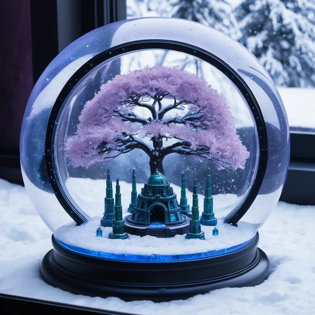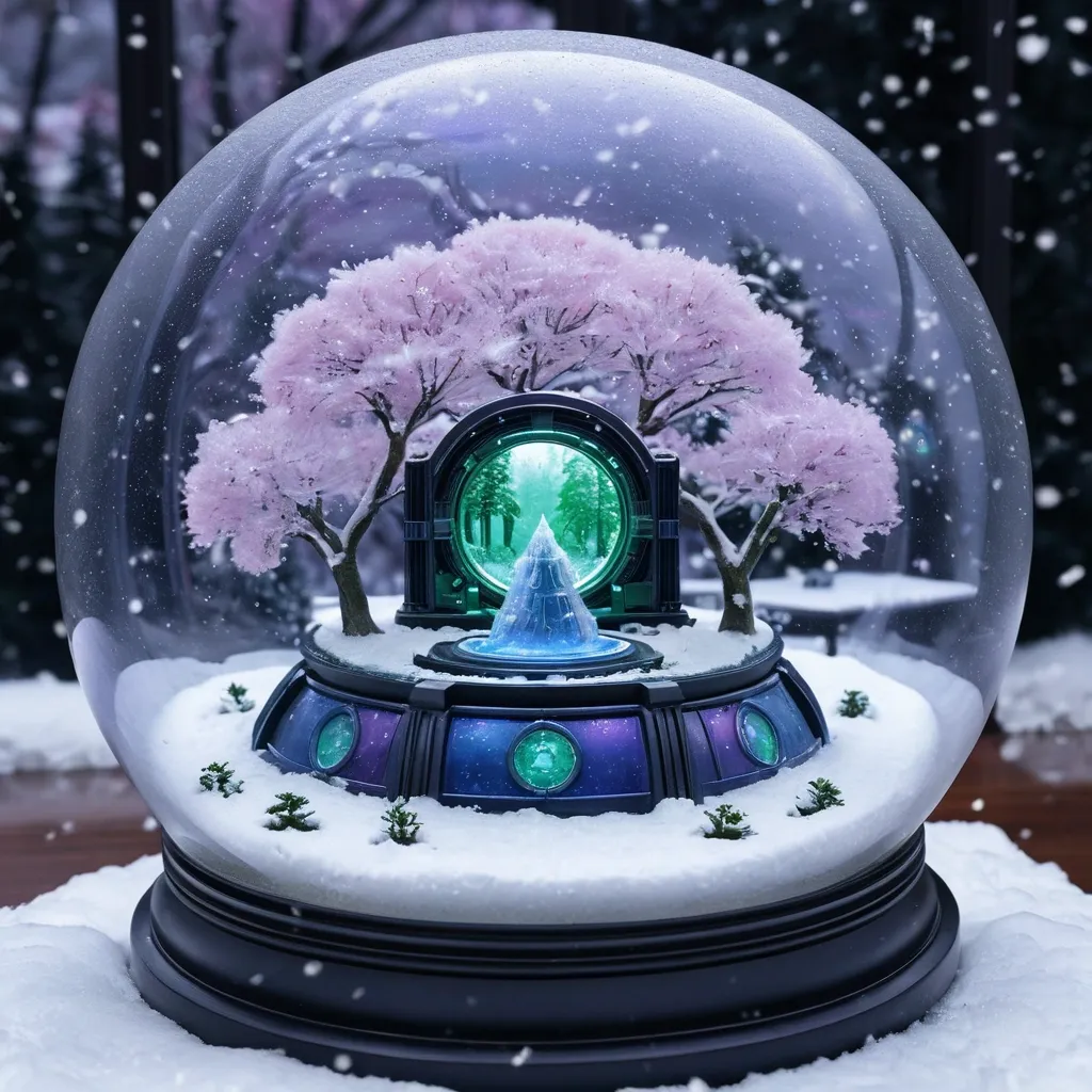 Inuq elderwoman dressed in traditional garments. Her face is suntanned , her eyes hazel , her hair white. She is wearring colorful woven tribal earrings. She has tribal markings on her forehead and chin. There are a few wrinkles around her eyes. The background is an Inuq fishing village , with blue , green , and red houses and skidoos. ,