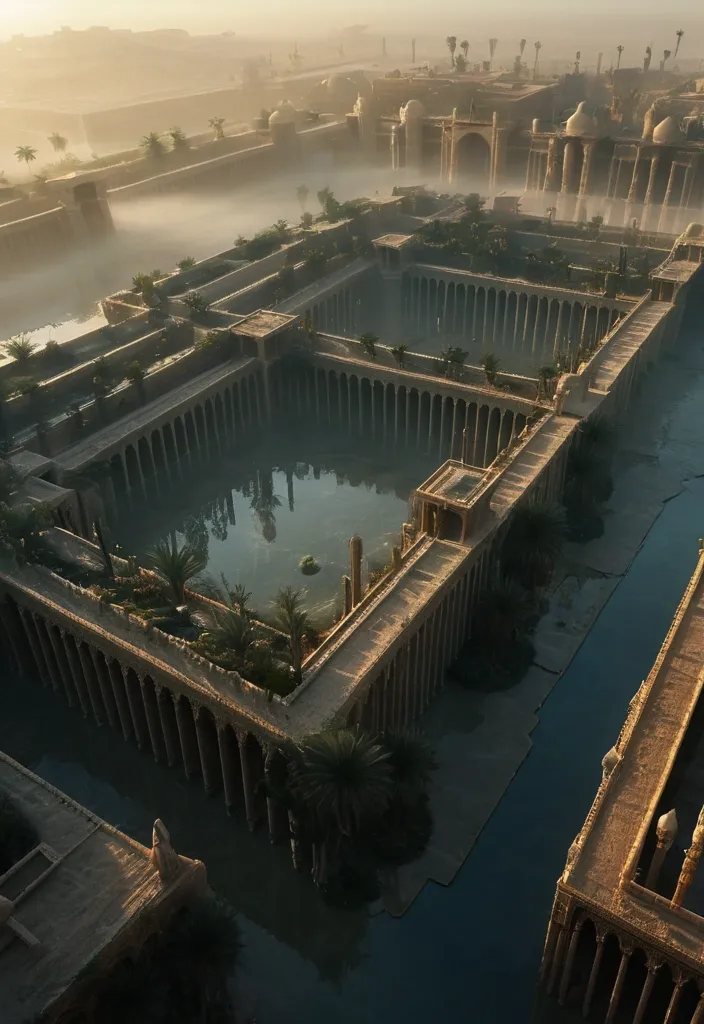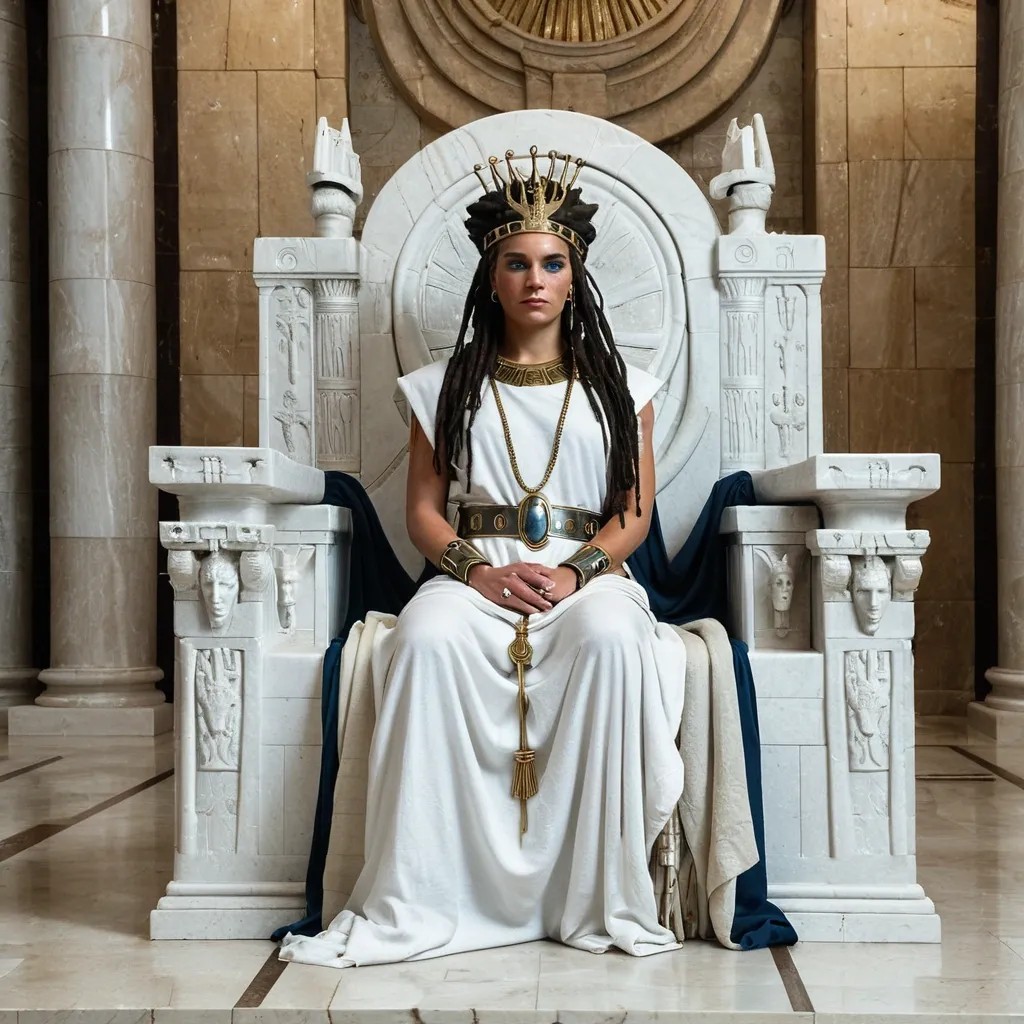 A queen sitting in the throne room in Atlantis. The throne is made from white marble , it is of Ionian and Minoean design. The queen is wearing ancient linen cloth toga-like drapery clothing. There are belts , armbands , and pinned fastening draping the dress. The queen is wearing a head ornament that resembles dreadlocks and horns. The queen is wearing a contrasting makeup: the top half of the face is fully covered by matte black. The bottom half of the face is matte white. The lips are painted blue. She has some advisors (men and women) standing close to her around the throne. ,