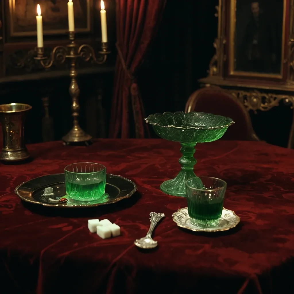 An image in the style of the 1992 movie Bram Stoker's Dracula (starring Gary Oldman , Keanu Reeves). An ornate glass cup contains absynthe green liquid. There are two sugar cubes next to the cup on the table , and two teaspoons. There is a candle with dim light on the table. The sugar cubes each have a drop of red stain on one of their corners. The tablecloth is dark crimson velvet. There is a Victorian paravan in the background. Use brown , dark yellow , and red colors for the paravan. ,
