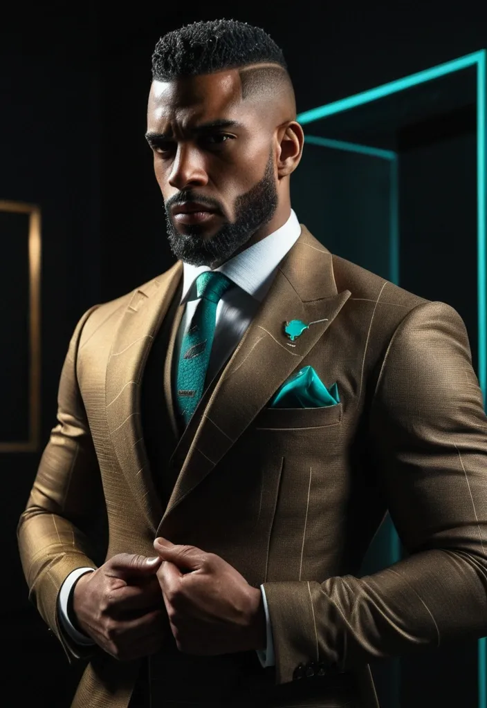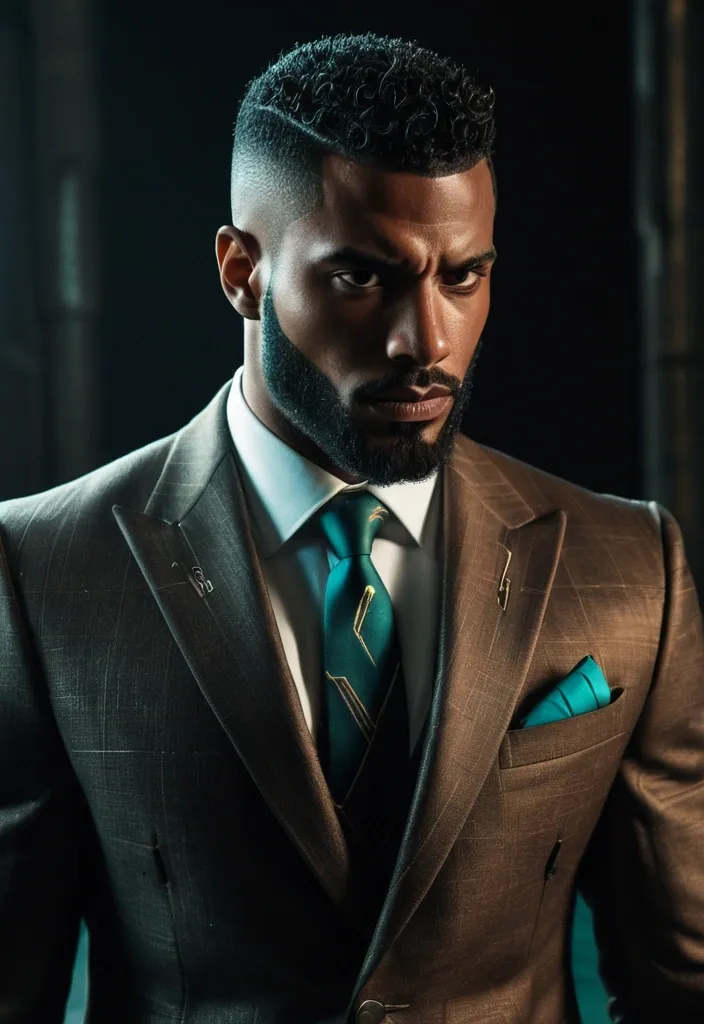He is an gorgeous African American man with a striking , sculpted hairstyle that blends precision and edge. The sides of his head are shaved clean , while the top is left textured and natural , short curls forming a controlled crown. A sleek metallic band arcs across his hairline like a deliberate accent rather than decoration , reinforcing a sense of discipline and intent. His face is intense and angular , brow slightly furrowed , eyes cast downward with focused restraint , as if he’s thinking several moves ahead.His build is powerful but refined—broad through the shoulders , solid through the chest , and carried with an upright , composed posture. This is not brute bulk , but strength honed and contained , the kind that comes from control rather than excess. A full , well-shaped beard frames his jaw and chin , dense and carefully groomed , adding gravity to his expression. The beard balances the sharp lines of his face , giving him a presence that feels authoritative and unyielding.He wears a tailored , futuristic suit in a rich bronze-gold tone , cut close to the body and threaded with subtle teal-lit seams that trace the structure of the garment. The jacket features sharp lapels , geometric insignia , and a precisely folded pocket square , paired with a dark shirt and textured tie beneath. The materials look heavy , expensive , and intentional—fashion built like armor. The scene around him is dim and atmospheric , washed in deep shadows with controlled highlights that skim across the fabric and his features , placing him in a quiet , cinematic space where power isn’t announced—it’s simply understood. ,