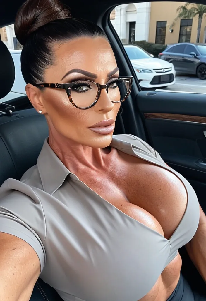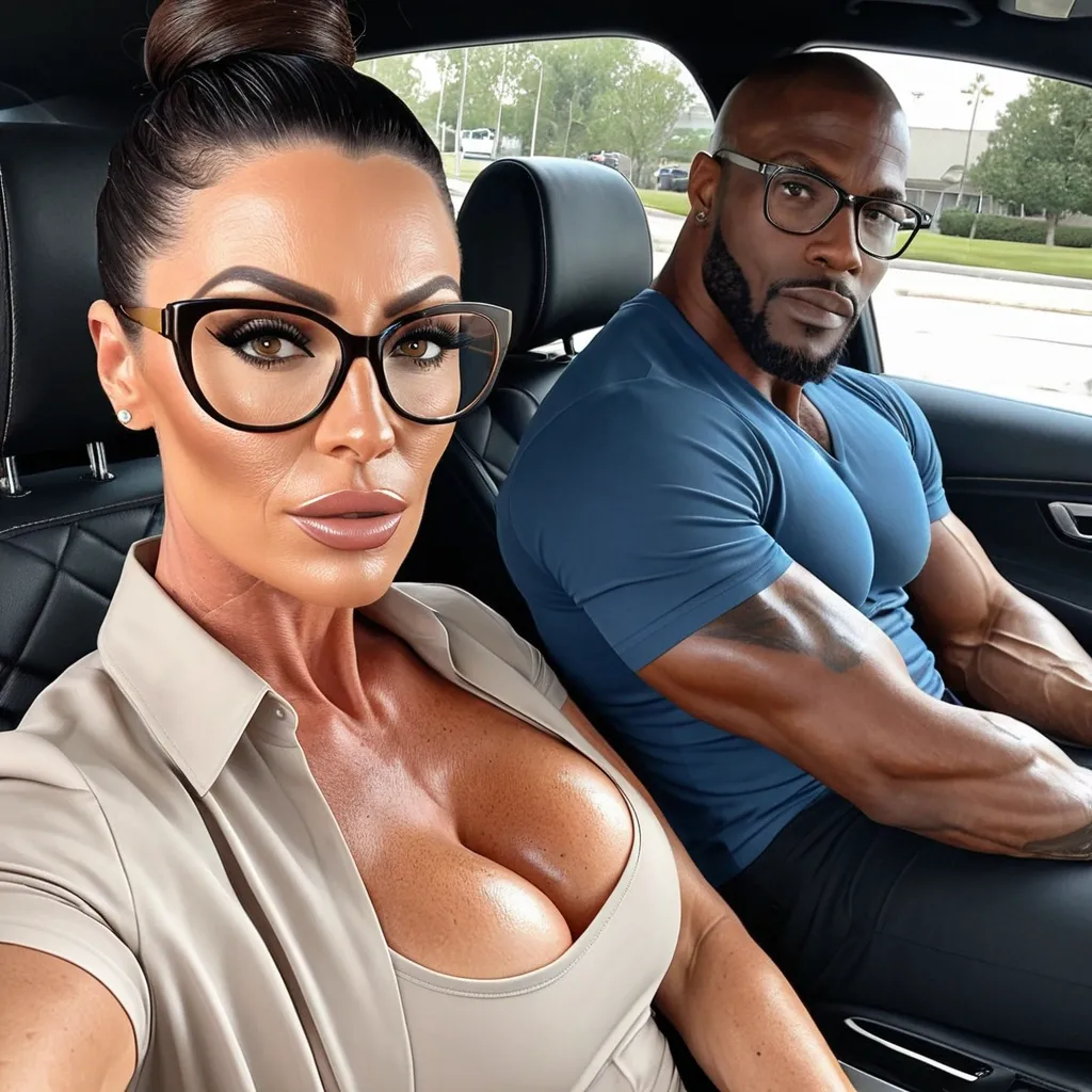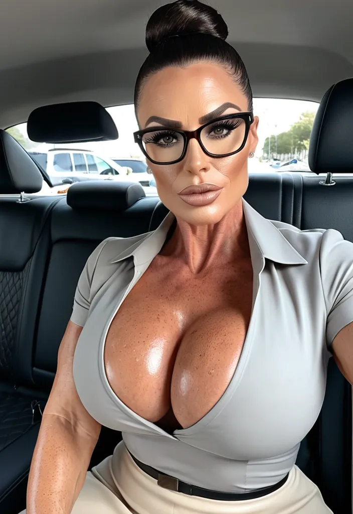 Generate Gorgeous 38 years old , female boss , Caucasian woman , bimbo , hourglass body , abnormally massive female bodybuilder , gorgeous , close up , full lips , big booty , brunette , freckles eye glasses , updo hair , one curl coming down on forehead slick back , shaved on the side , , , feminine silhouette , too big breast , big booty , sexy thighs abs , silhouette , up close , flexing biceps , beautiful brown eyes , legs are iconic and defining physical feature , both visually and in terms of combat ability.wearing an outfit that is a striking blend of elegance , power , and femininity , designed to command attention in any room. The suit is tailored to perfection , hugging the wearer’s curves with precision while emphasizing a structured silhouette. The fabric itself is a refined grey tweed patterned with subtle white grid lines , giving the suit a texture that feels both sophisticated and modern. The blazer features broad blue lapels and gold button accents , adding a luxurious touch that elevates the look beyond typical business attire. The matching high-waisted trousers elongate the frame , further enhancing the poised and commanding effect of the ensemble.The styling choices amplify the boldness of the suit. The inner blouse is a silky , greybutton-down shirt that complements the tweed’s tone while introducing a softer , feminine balance to the sharp tailoring of the jacket. The blouse peeks out neatly from under the blazer , maintaining elegance without drawing focus away from the suit’s commanding cut. Accessories are kept minimal yet intentional: a delicate layered gold necklace and hoop earrings that add glimmers of light and luxury without overpowering the outfit. The choice of voluminous , honey-brown braids cascading down her shoulders frames the face with both confidence and glamour , completing the commanding visual.Altogether , this look communicates a blend of authority and allure. It is business-ready yet fashion-forward , balancing corporate structure with vibrant femininity. The color palette blue , grey and gold avoids being overly delicate , instead embracing the richness of texture , structure , and presence. This is the kind of ensemble that speaks to ambition , sophistication , and personal style—ideal for someone who thrives in positions of influence but insists on expressing her individuality with bold elegance. It’s not just clothing—it’s a statement of power wrapped in grace. In luxury living legs that could crush a watermelon , skirt high boots are a bold and striking statement piece , crafted in glossy black patent leather that gives them a sleek , polished finish. Rising to just below the knee , the boots feature three adjustable buckle straps along the shaft , adding both edge and detail to their design. The towering stiletto heel , paired with a thick platform sole , creates an ultra-dramatic silhouette that elongates the leg and exudes power and confidence. With their combination of shine , height , and structure , these boots perfectly balance fierce femininity with high-fashion allure. High cheekbones , prominent jawline , gorgeous big brown eyes , freckles , enormous breast , gray , gorgeous brown eyes , enormous butt , enormous breast sitting in backseat of car , black oxford shirt , beige skirt , sitting next to handsome African American man in blue oxford t-shirt , and black pants ,