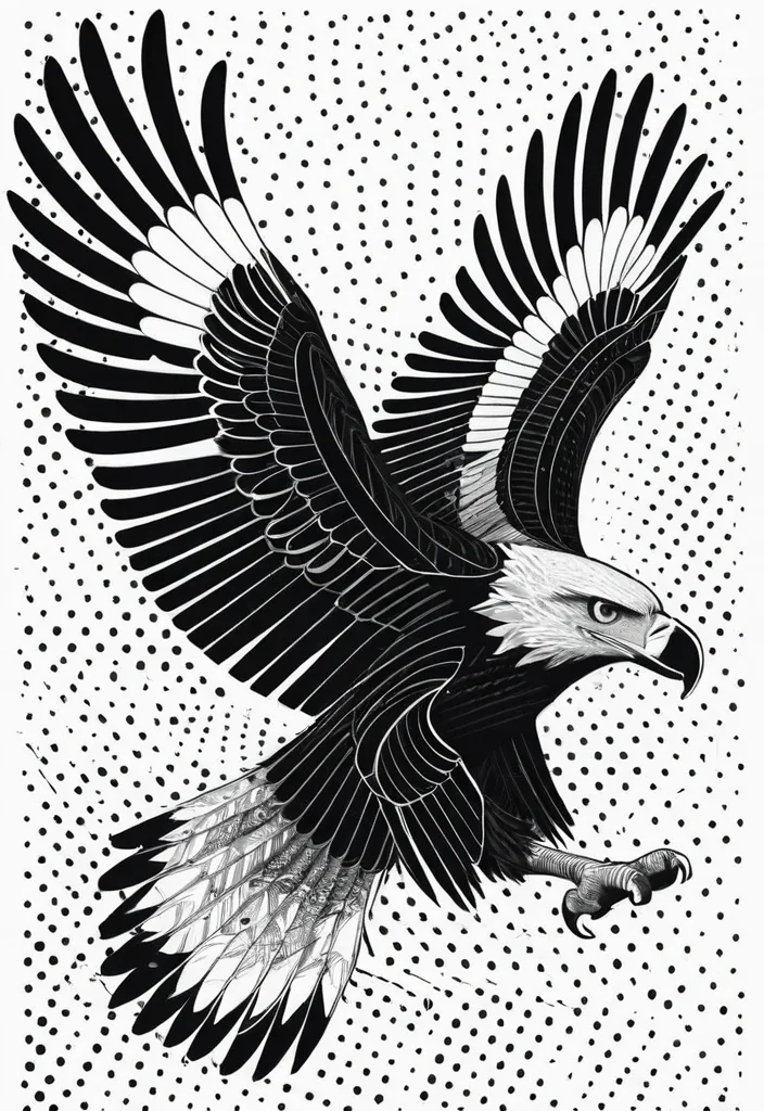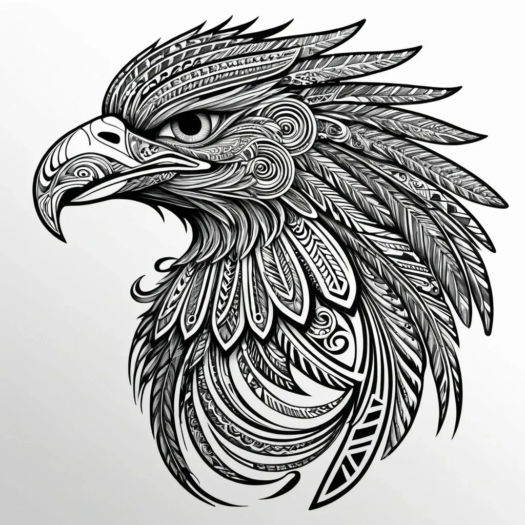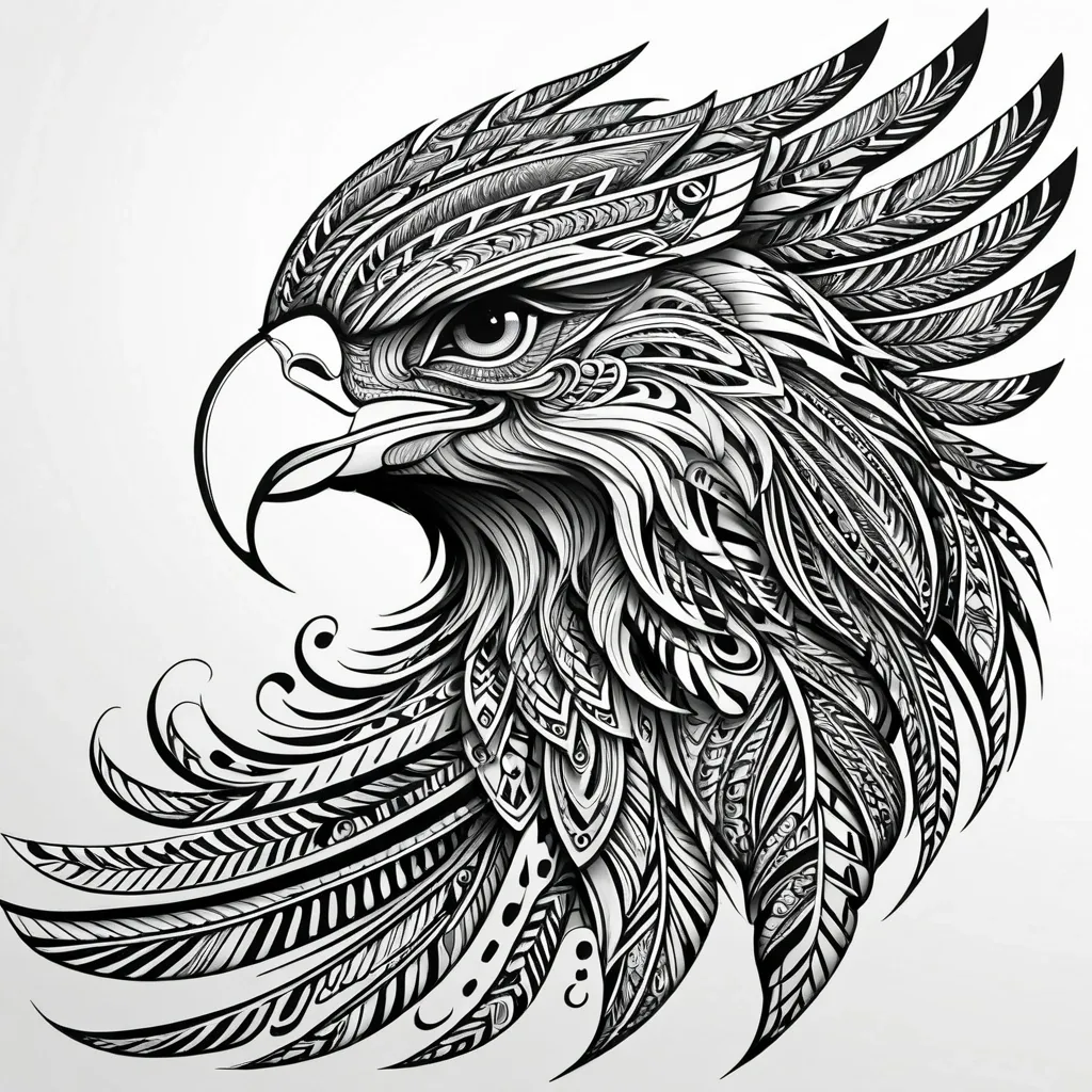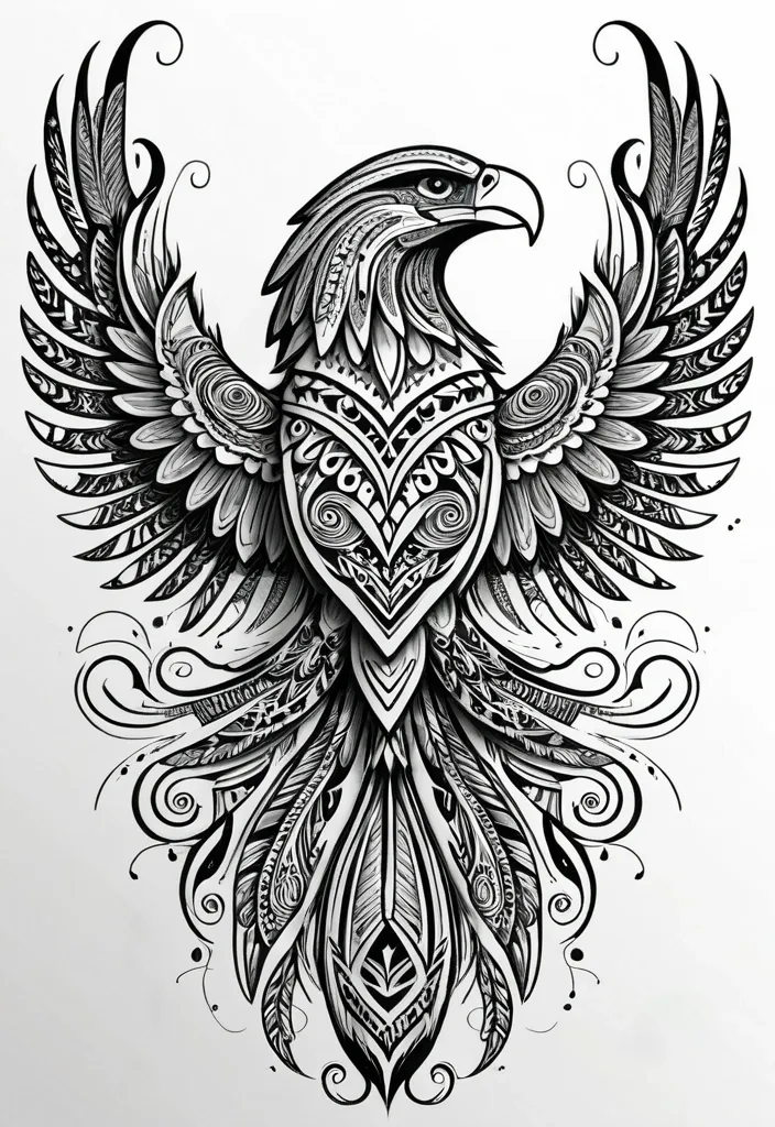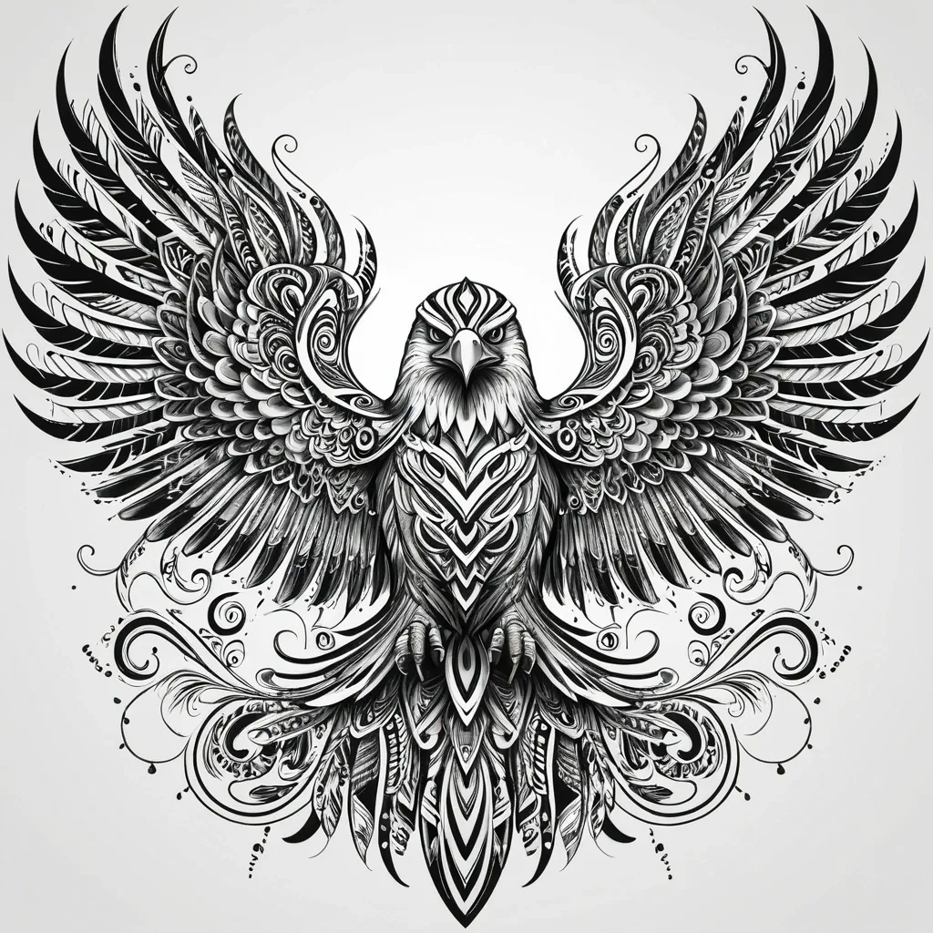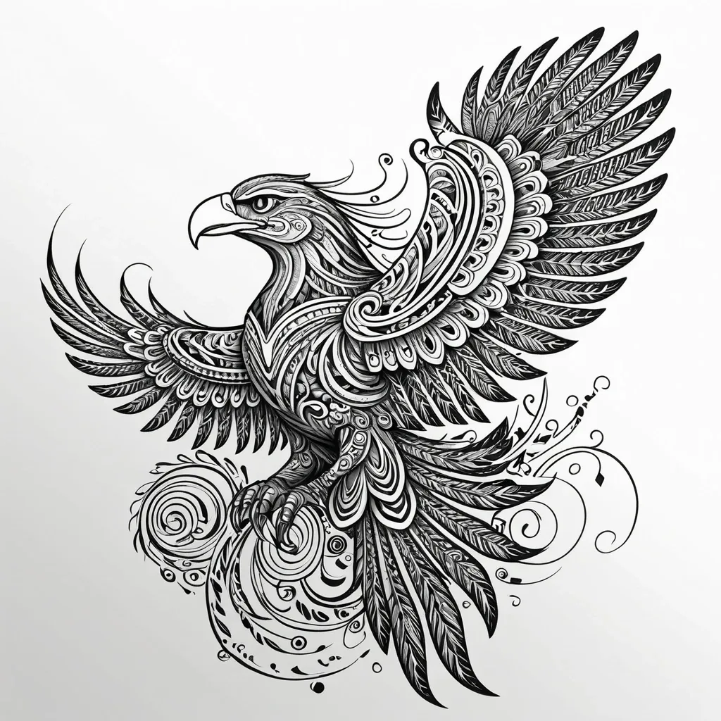 “Create an illustration of an eagle in a tribal , ornamental , line-art style. The drawing should be made only with black contour lines , with many flowing patterns , curves , spirals , and abstract decorative shapes inside the body , similar to Polynesian or ethnic tattoo motifs. The eagle should look expressive and dynamic , with detailed ornamental textures filling the wings , head , and feathers. The style must match the attached reference: bold outlines , intricate internal patterns , smooth organic shapes , and a hand-drawn look. White background , no shading , no colors — only clean black line art.” ,