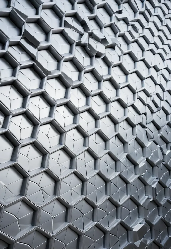 full hd изображение (вид сверху) стены из очень крупных октагональных алюминиевых (с отчетливо видимой структурой металла на срезе) сплошных ячеек разной высоты , у ячеек нет границ и расположение очень плотное без зазоров ,