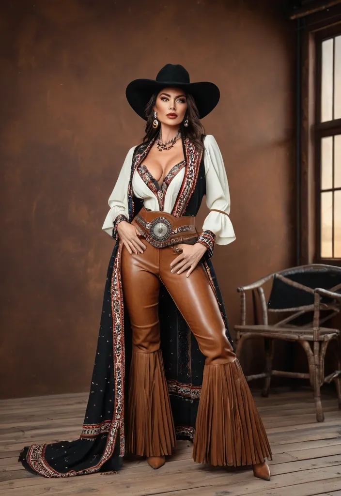 A beautiful western cowgirl , exquisite clothing and accessories , full body shot , professional photography ,