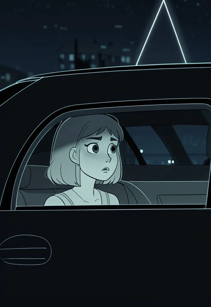 animation storyboard frame , rough sketch animatic style , female character with triangle body shape secretly watching from inside a nearby car , night scene , cinematic framing ,
