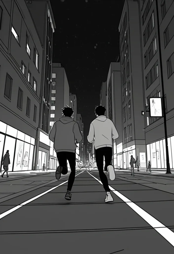 animation storyboard frame , rough sketch animatic style , wide shot of both characters running through a modern city street at night ,