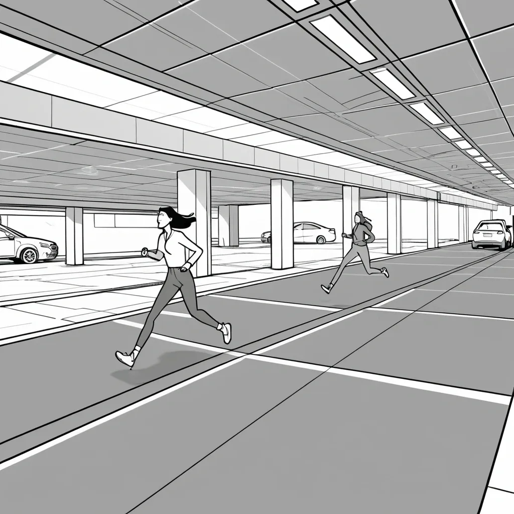 animation storyboard frame , rough sketch animatic style , woman running toward the man in the parking garage , geometric cartoon characters , dynamic movement ,