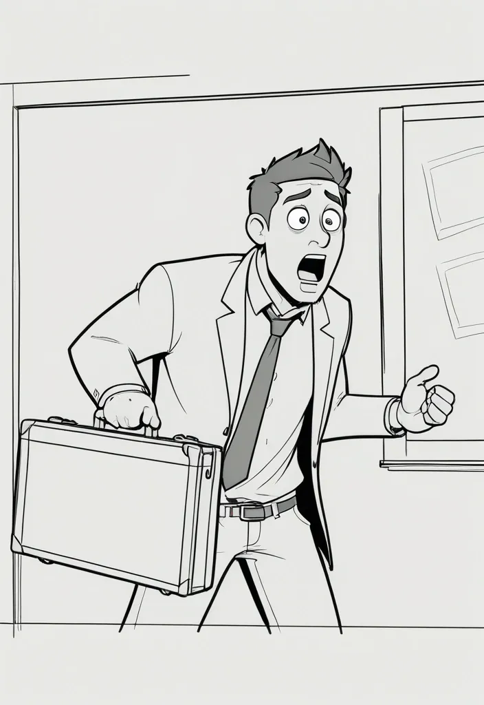 animation storyboard frame , rough sketch animatic style , man reacting surprised as the briefcase is taken , expressive cartoon pose ,