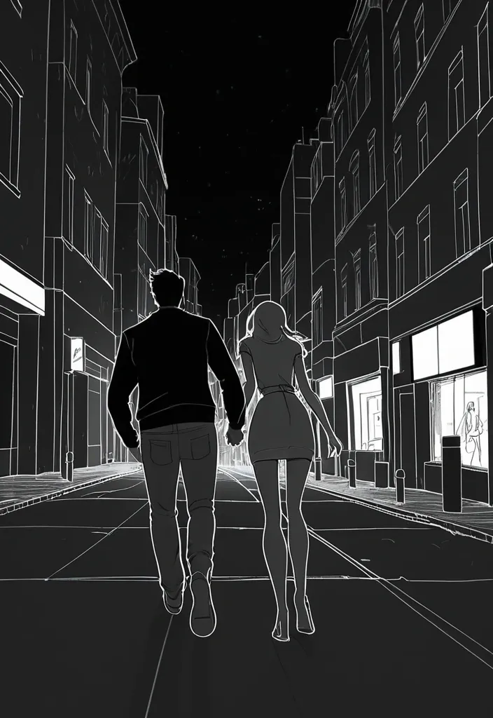 animation storyboard frame , rough sketch animatic style , man chasing the woman through the city street at night ,