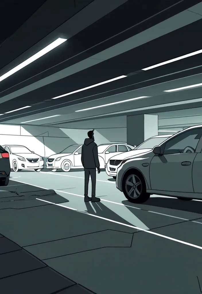 animation storyboard frame , rough sketch animatic style , simple cartoon characters made of geometric body shapes , inverted triangle body man waiting next to a car in an underground parking garage , cinematic angle ,