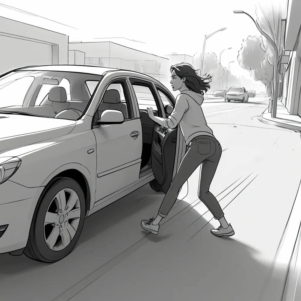 animation storyboard frame , rough sketch animatic style , woman suddenly opening the car door , dynamic pose , cinematic perspective ,