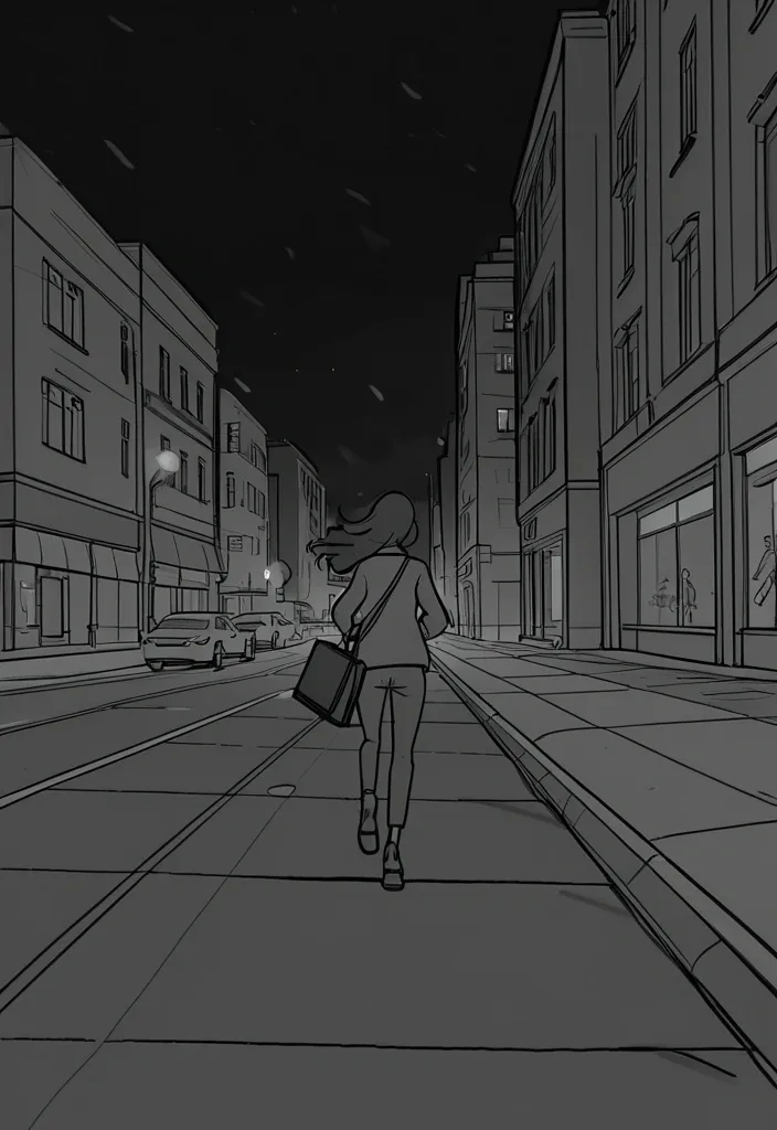 animation storyboard frame , rough sketch animatic style , woman running toward the street holding the briefcase at night , city environment ,