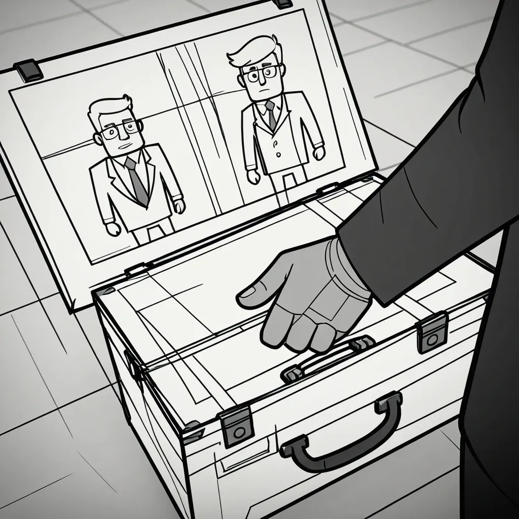 animation storyboard frame , rough sketch animatic style , close shot of a briefcase being handed to a man , geometric cartoon characters , cinematic close up ,